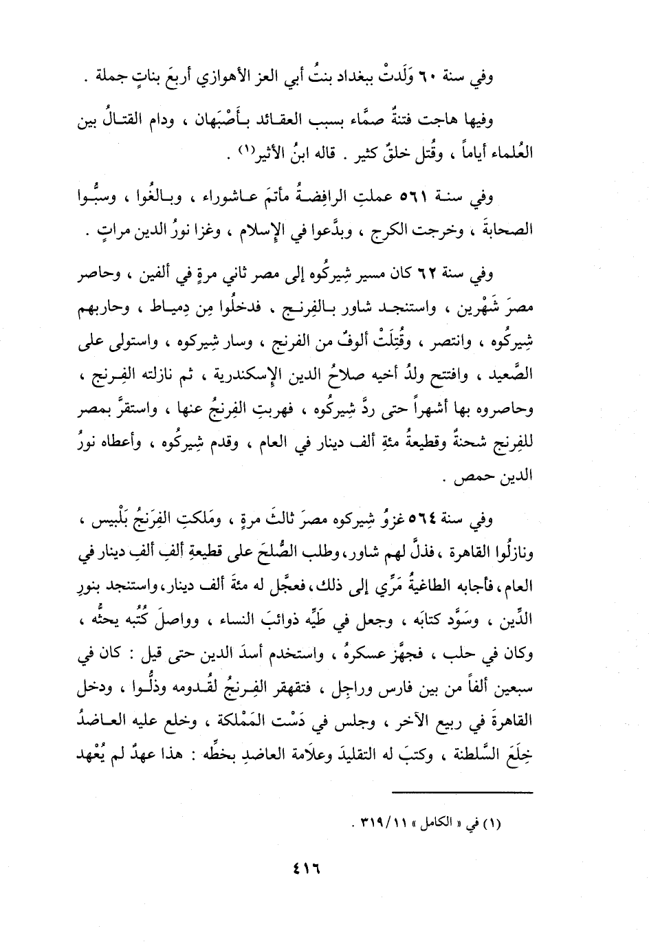 وَفِي سَنَةِ 62: كَانَ مسير شِيْركُوه إِلَى مِصْرَ ثَانِي مرَّة فِي أَلْفَيْن، وَحَاصَرَ مِصْر شَهْرَيْنِ، وَاسْتنجد شَاور بِالفِرَنْج، فَدَخَلُوا مِنْ دِمْيَاط، وَحَارَبَهُم شِيْركُوه، وَانتصر، وَقتلت أُلُوف مِنَ الفِرَنْج، وَسَارَ شِيْركُوه، وَاسْتَوْلَى عَلَى الصّعيد، وَافتَتَح وَلد أَخِيْهِ صلاَح الدِّيْنِ الإِسْكَنْدَرِيَّة، ثُمَّ نَازلته الفِرَنْج، وَحَاصروهُ بِهَا أَشْهُراً حَتَّى ردّ شِيْركُوه، فَهَرَبت الفِرَنْج عَنْهَا، وَاسْتقر بِمِصْرَ لِلْفرنج شحنَة وَقطيعَةُ مائَةِ أَلْف دِيْنَار فِي العَامِ، وَقَدِمَ شِيْركُوه، وَأَعْطَاهُ نُوْر الدِّيْنِ حِمْص.