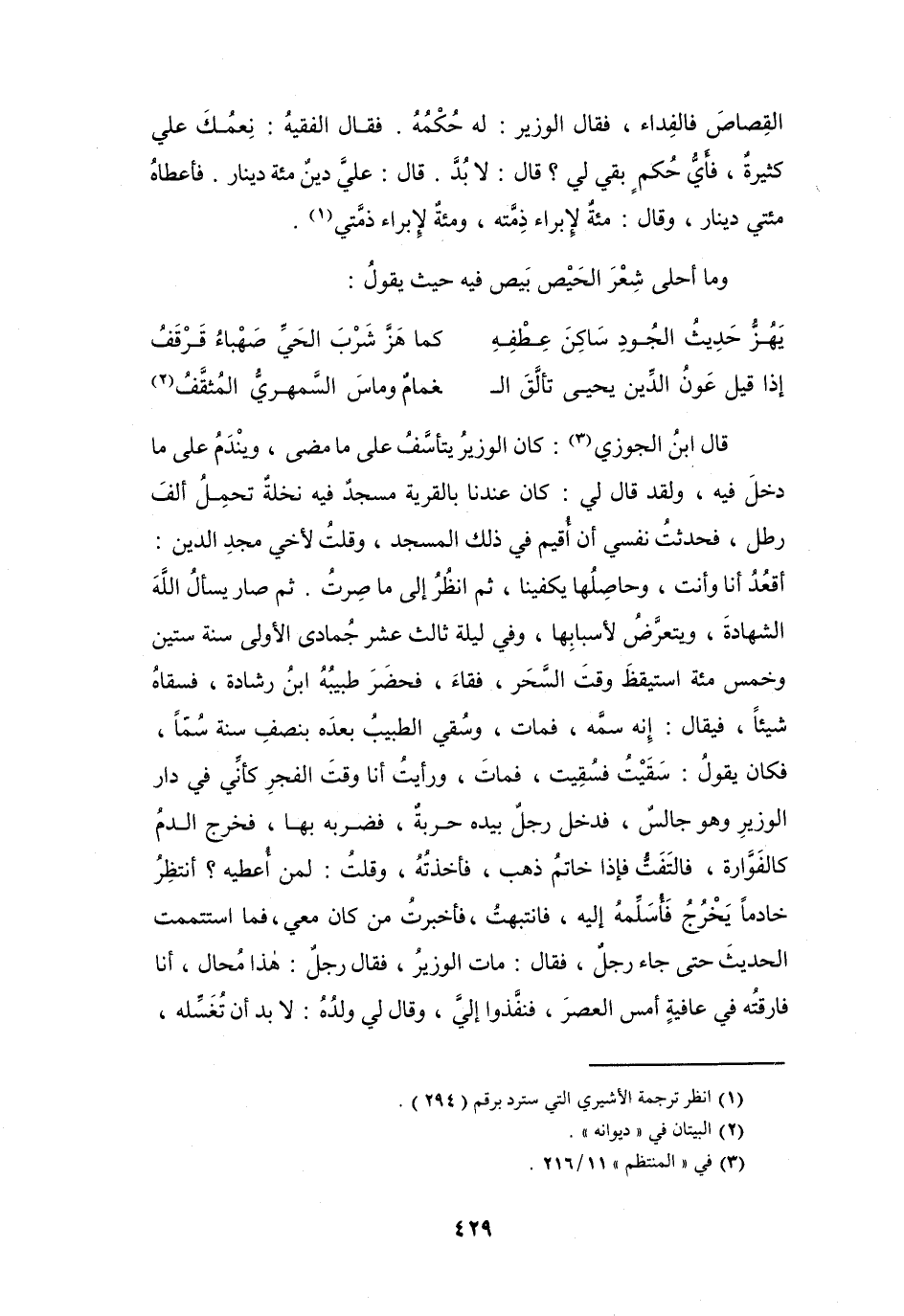 وَرَأَيْتُ أَنَا وَقتَ الفَجْرِ كَأَنِّي فِي دَارِ الوَزِيْرِ وَهُوَ جَالِسٌ، فَدَخَلَ رَجُلٌ بِيَدِهِ حَرْبَةٌ فَضَرَبَهُ بِهَا، فَخَرَجَ الدَّمُ كَالفَوَّارَةِ، فَالْتَفَتَ، فَإِذَا خَاتمٌ ذَهَبٌ، فَأَخَذتُهُ وَقُلْتُ: لِمَنْ أُعْطيهِ؟ أَنْتظرُ خَادِماً يَخْرُجُ فَأُسلِّمُهُ إِلَيْهِ، فَانْتبهْتُ، فَأَخْبَرتُ مَنْ كَانَ مَعِي، فَمَا اسْتَتْمَمْتُ الحَدِيْثَ حَتَّى جَاءَ رَجُلٌ فَقَالَ: مَاتَ الوَزِيْرُ.
