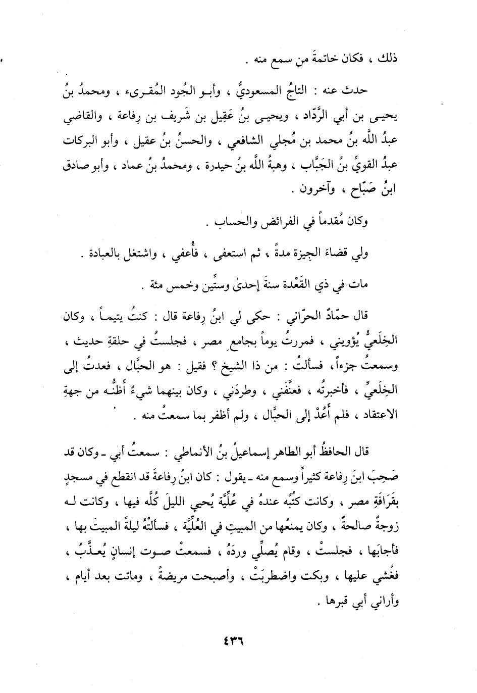 قَالَ حَمَّادٌ الحَرَّانِيُّ: حَكَى لِي ابْنُ رِفَاعَةَ، قَالَ: