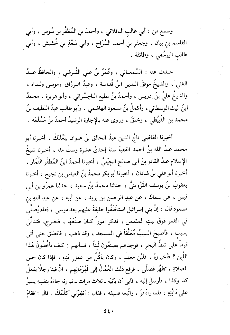 أَخْبَرَنَا القَاضِي تَاجُ الدِّيْنِ عَبْدُ الخَالِقِ بنُ عُلْوَانَ بِبَعْلَبَكَّ، أَخْبَرَنَا أَبُو مُحَمَّدٍ عَبْدُ اللهِ بنُ أَحْمَدَ الفَقِيْهُ سَنَةَ إِحْدَى عَشْرَةَ وَسِتِّ مائَةٍ، أَخْبَرَنَا شَيْخُ الإِسْلاَمِ عَبْدُ القَادِرِ بنُ أَبِي صَالِحٍ الجِيْلِيُّ، أَخْبَرَنَا أَحْمَدُ بنُ المُظَفَّرِ التَّمَّارُ، أَخْبَرَنَا أَبُو عَلِيٍّ بنُ شَاذَانَ، أَخْبَرَنَا أَبُو بَكْرٍ مُحَمَّدُ بنُ العَبَّاسِ بنِ نَجِيْحٍ، أَخْبَرَنَا يَعْقُوْبُ بنُ يُوْسُفَ القَزْوِيْنِيُّ، حَدَّثَنَا مُحَمَّدُ بنُ سَعِيْدٍ، حَدَّثَنَا عَمْرُو بنُ أَبِي قَيْسٍ، عَنْ سِمَاكٍ، عَنْ عَبْدِ الرَّحْمَنِ بنِ يَزِيْدَ، عَنْ أَبِيْهِ، عَنْ عَبْدِ اللهِ بنِ مَسْعُوْدٍ، قَالَ: