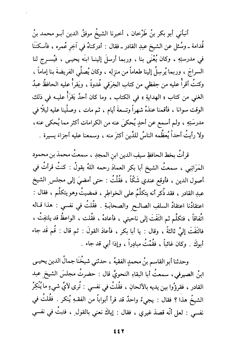 أَنبَأَنِي أَبُو بَكْرٍ بنُ طَرْخَانَ، أَخْبَرَنَا الشَّيْخُ مُوَفَّقُ الدِّيْنِ أَبُو مُحَمَّدٍ بنُ قُدَامَةَ، وَسُئِلَ عَنِ الشَّيْخِ عَبْدِ القَادِرِ، فَقَالَ: