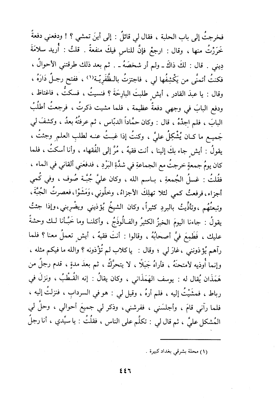 وَلَمْ أَرَ شَخْصَهُ، ثُمَّ بَعْدَ ذَلِكَ طَرَقَتْنِي الأَحْوَالُ، فَكُنْتُ أَتَمنَّى مَنْ يَكشِفُهَا لِي، فَاجتزْتُ بِالظَّفَرِيَّةِ (1) ، فَفَتَحَ رَجُلٌ دَارَهُ، وَقَالَ: يَا عَبْدَ القَادِرِ، أَيشٍ طلبتَ البَارِحَةَ؟