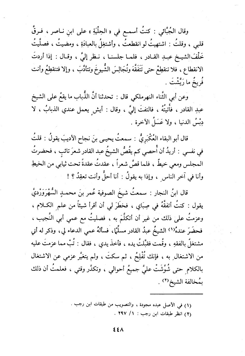 كُنْتُ أَتفقَّهُ فِي صِبَايَ، فَخطرَ لِي أَنْ أَقرَأَ شَيْئاً مِنْ عِلمِ الكَلاَمِ، وَعزمتُ عَلَى ذَلِكَ مِنْ غَيْرِ أَنْ أَتكلَّمَ بِهِ، فَصَلَّيْتُ مَعَ عَمِّي أَبِي النَّجِيْبِ، فَحضرَ عِنْدَهُ (1) الشَّيْخُ عَبْدُ القَادِرِ مُسلِّماً، فَسَأَلَهُ عمِّي الدُّعَاءَ لِي، وَذَكَرَ لَهُ أَنِّي مُشْتَغِلٌ بِالفِقْهِ، وَقُمْتُ فَقبَّلْتُ يَدَهُ، فَأَخَذَ يَدِي، فَقَالَ: تُبْ مِمَّا عزَمْتَ عَلَيْهِ مِنَ الاشتغَالِ بِهِ، فَإِنَّكَ تُفْلِحُ.