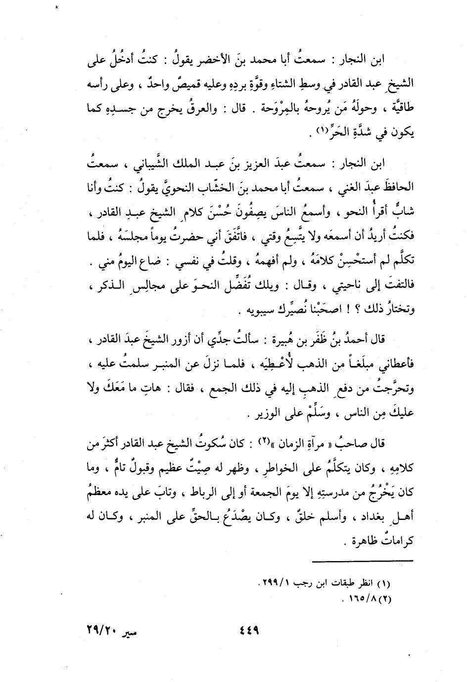كُنْتُ وَأَنَا شَابّ أَقرَأُ النَّحْو، وَأَسْمَعُ النَّاس يَصفُوْنَ حسن كَلاَم الشَّيْخ عَبْد القَادِر، فَكُنْت أُرِيْد أَنْ أَسْمَعه وَلاَ يَتَّسِع وَقتِي، فَاتَّفَقَ أَنِّي حضَرت يَوْماً مَجْلِسه، فَلَمَّا تَكَلَّمَ لَمْ أَسْتحسن كَلاَمه، وَلَمْ أَفهمه، وَقُلْتُ فِي نَفْسِي: ضَاع اليَوْم مِنِّي.