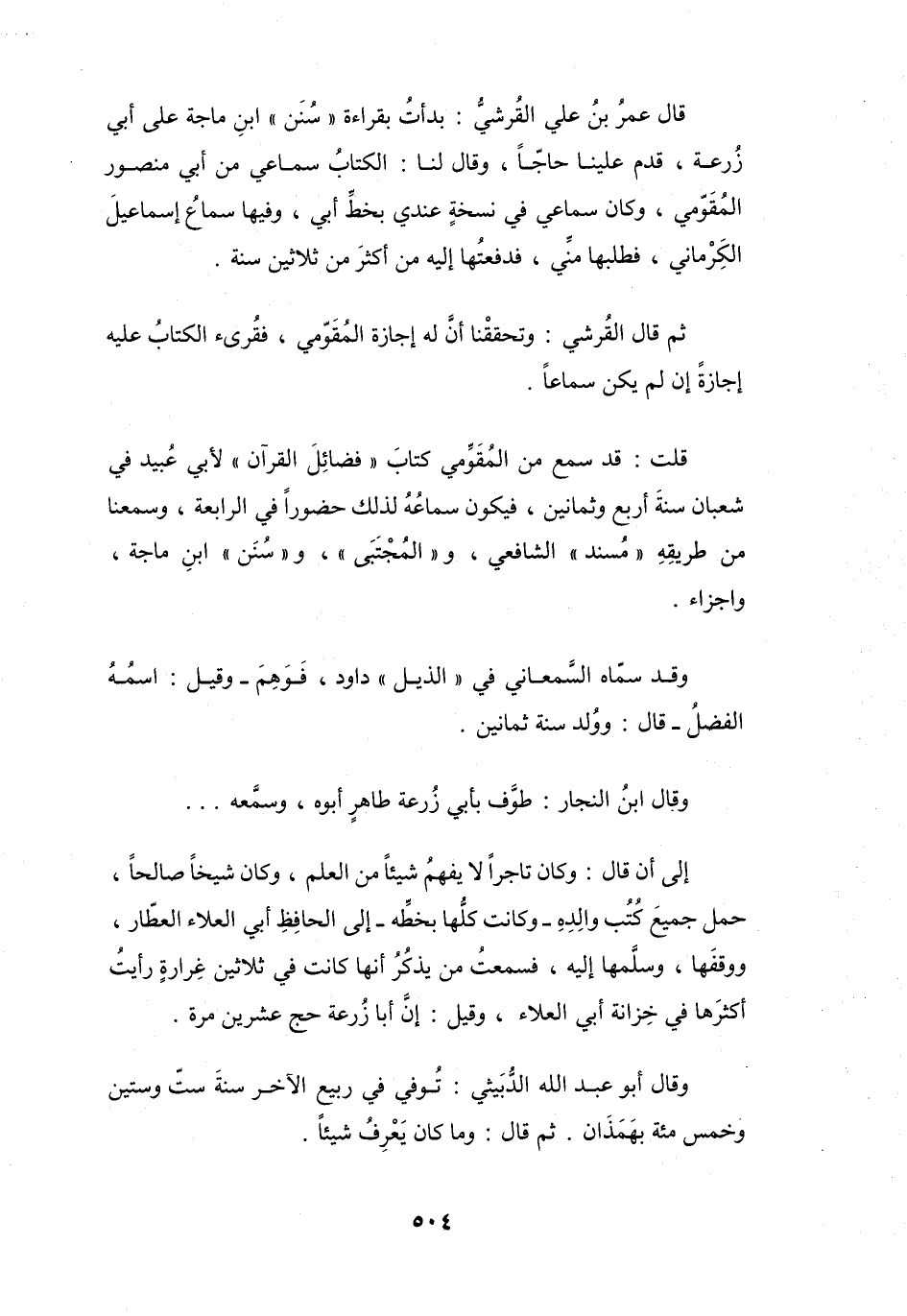 قَالَ عُمَرُ بنُ عَلِيٍّ القُرَشِيّ: بَدَأْتُ بقِرَاءة (سُنَن ابْنِ مَاجَه) عَلَى أَبِي زُرْعَةَ، قَدِمَ عَلَيْنَا حَاجّاً، وَقَالَ لَنَا: الكِتَاب سَمَاعِي مِنْ أَبِي مَنْصُوْرٍ المُقَوِّمِيّ، وَكَانَ سَمَاعِي فِي نُسْخَةٍِ عِنْدِي بِخَطِّ أَبِي، وَفِيْهَا سَمَاعُ إِسْمَاعِيْلَ الكَرْمَانِيّ، فَطَلَبَهَا مِنِّي، فَدَفَعتُهَا إِلَيْهِ مِنْ أَكْثَر مِنْ ثَلاَثِيْنَ سَنَةً.