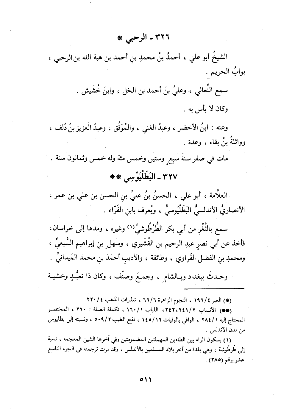 (1) بسكون الراء بين الطاءين المهملتين المضمومتين وفي آخرها الشين المعجمة، نسبة إلى طرطوشة، وهي بلدة من آخر بلاد المسلمين بالاندلس، وقد مرت ترجمته في الجزء التاسع عشر برقم (285) .