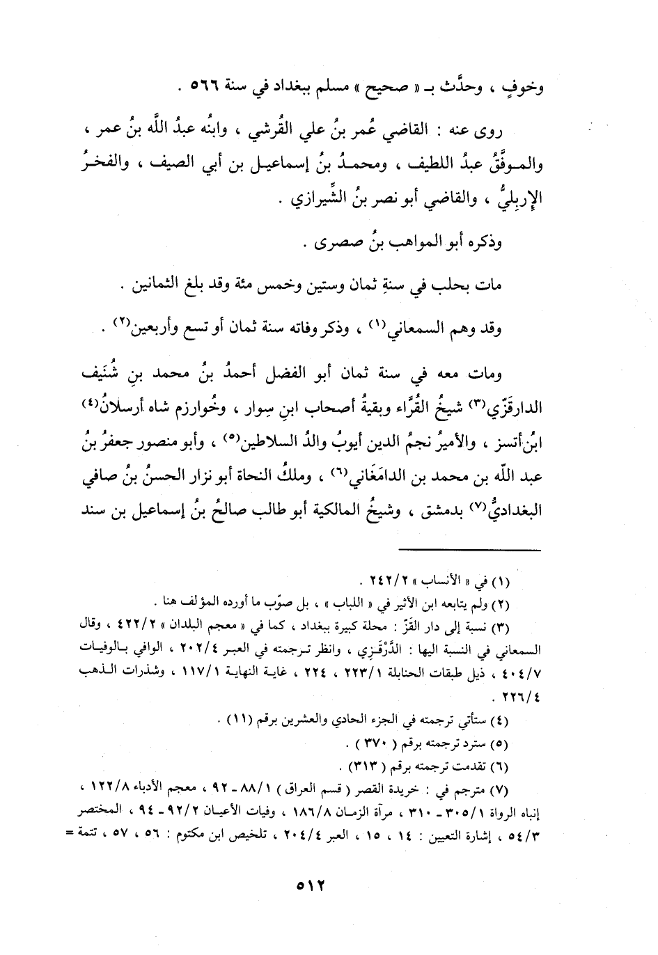 (7) مترجم في: خريدة القصر (قسم العراق) 1 / 88 - 92، معجم الأدباء 8 / 122، إنباه الرواة 1 / 305 - 310، مرآة الزمان 8 / 186، وفيات الأعيان 2 / 92 - 94، المختصر 3 / 54، إشارة التعيين: 14، 15، العبر 4 / 204، تلخيص ابن مكتوم: 56، 57، تتمة =