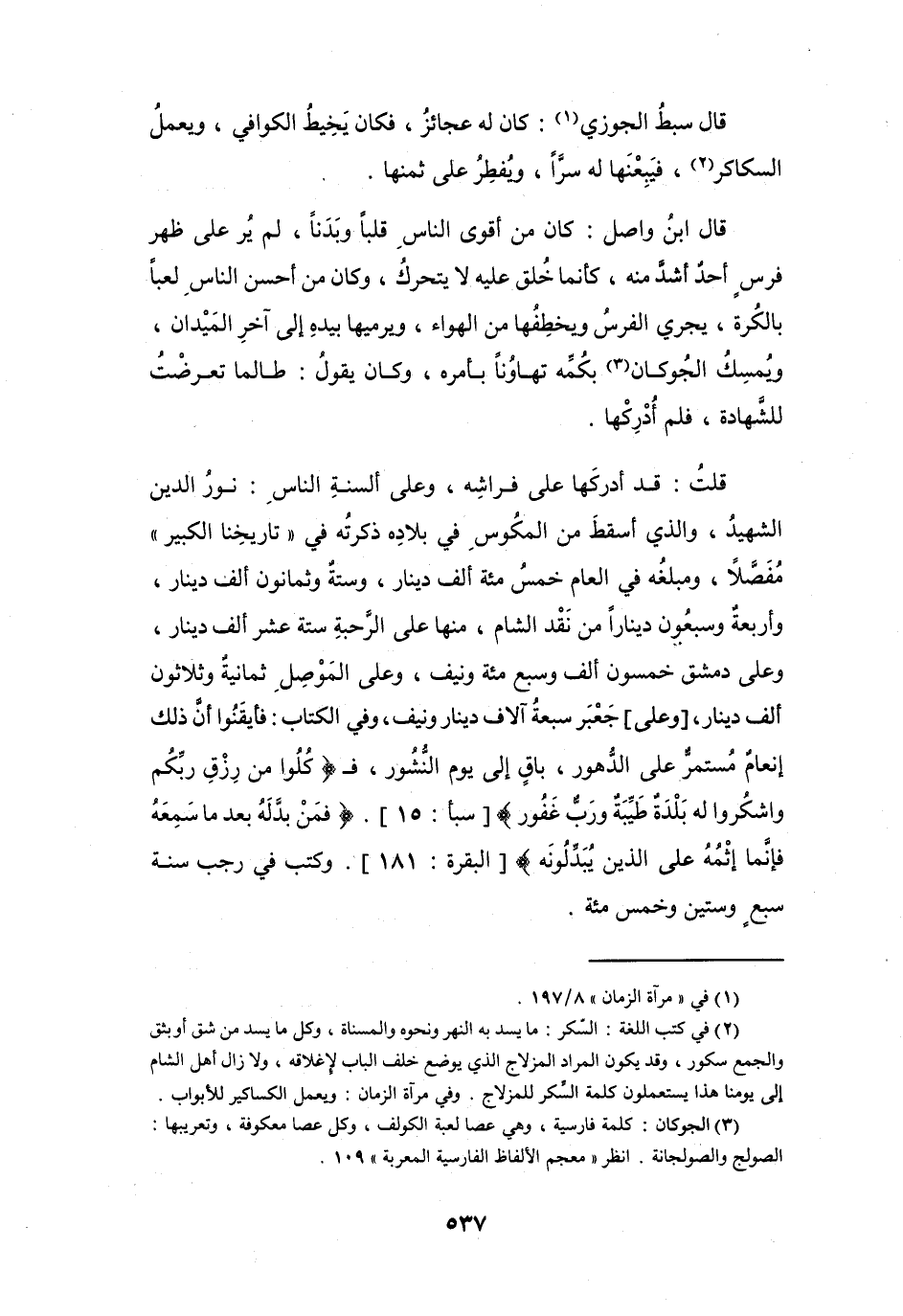قُلْتُ: قَدْ أَدْركهَا عَلَى فِرَاشه، وَعَلَى أَلسَنَة النَّاس: نُوْر الدِّيْنِ الشَّهِيْد، وَالَّذِي أَسقط مِنَ المُكُوْس فِي بِلاَده ذكرتُه فِي (تَارِيْخِنَا الكَبِيْر) مفصَّلاً، وَمَبْلَغُه فِي العَامِ خَمْسُ مائَةِ أَلْفِ دِيْنَارٍ، وَسِتَّةٌ وَثَمَانُوْنَ أَلفَ دِيْنَارٍ، وَأَرْبَعَة وَسَبْعُوْنَ دِيْنَاراً مِنْ نَقد الشَّام، مِنْهَا عَلَى الرّحبَة سِتَّةَ عَشَرَ أَلفَ دِيْنَار، وَعَلَى دِمَشْقَ خَمْسُوْنَ أَلْفاً وَسَبْعُ مائَةٍ وَنَيِّف، وَعَلَى المَوْصِل ثَمَانِيَة وَثَلاَثُوْنَ أَلْفَ دِيْنَار، وَعَلَى جَعْبَر سَبْعَة آلاَف دِيْنَار وَنَيِّف، وَفِي الكِتَابِ: فَأَيقنُوا أَنَّ ذَلِكَ إِنعَام مُسْتمر عَلَى الدّهور، باقٍ إِلَى يَوْم النُّشُوْر، فَـ {كُلُوا مِنْ رِزْقِ رَبِّكُم وَاشْكُرُوا لَهُ، بَلْدَةٌ طَيِّبَةٌ وَرَبٌّ غَفُوْر} [سَبَأُ: 15] ، {فَمَنْ بَدَّلَهُ بَعْدَ مَا سَمِعَهُ، فَإِنَّمَا إِثْمُهُ عَلَى الَّذِيْنَ يُبَدِّلُوْنَهُ} [البَقَرَةُ: 181] .