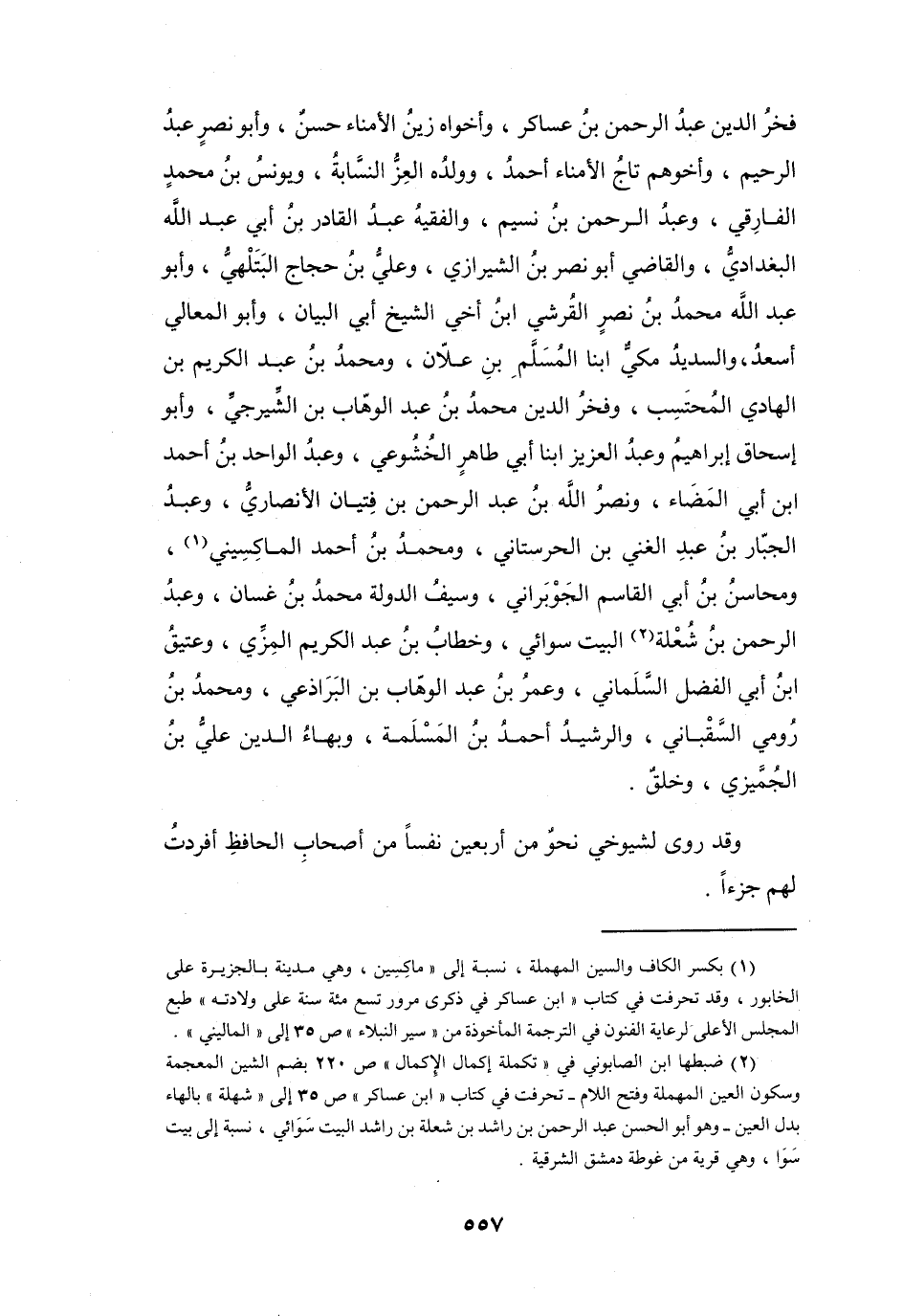 (2) ضبطها ابن الصابوني في " تكملة إكمال الإكمال " ص 220 بضم الشين المعجمة وسكون العين المهملة وفتح اللام - تحرفت في كتاب " ابن عساكر " ص 35 إلى " شهلة بالهاء بدل العين - وهو أبو الحسن عبد الرحمن بن راشد بن شعلة بن راشد البيت سوائي، نسبة إلى بيت سوا، وهي قرية من غوطة دمشق الشرقية.