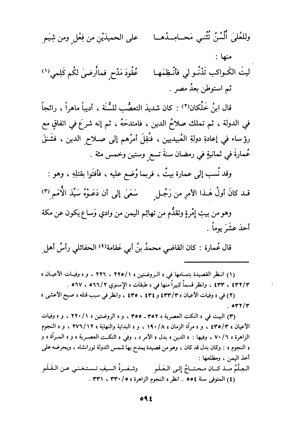 قَالَ ابْنُ خَلِّكَانَ (2) : كَانَ شَدِيد التَّعَصُّب لِلسُّنَّةِ، أَدِيْباً مَاهراً، رَائِجاً فِي الدَّوْلَة، ثُمَّ تَملك صَلاَح الدِّيْنِ، فَامْتَدَحه، ثُمَّ إِنَّهُ شرع فِي اتِّفَاقٍ مَعَ رُؤسَاء فِي إِعَادَة دَوْلَة العُبيديين، فَنُقل أَمرُهُم إِلَى صَلاَح الدِّيْنِ، فَشنقَ عُمَارَة فِي ثَمَانِيَةٍ، فِي رَمَضَانَ، سَنَةَ تِسْعٍ وَسِتِّيْنَ وَخَمْسِ مائَةٍ.