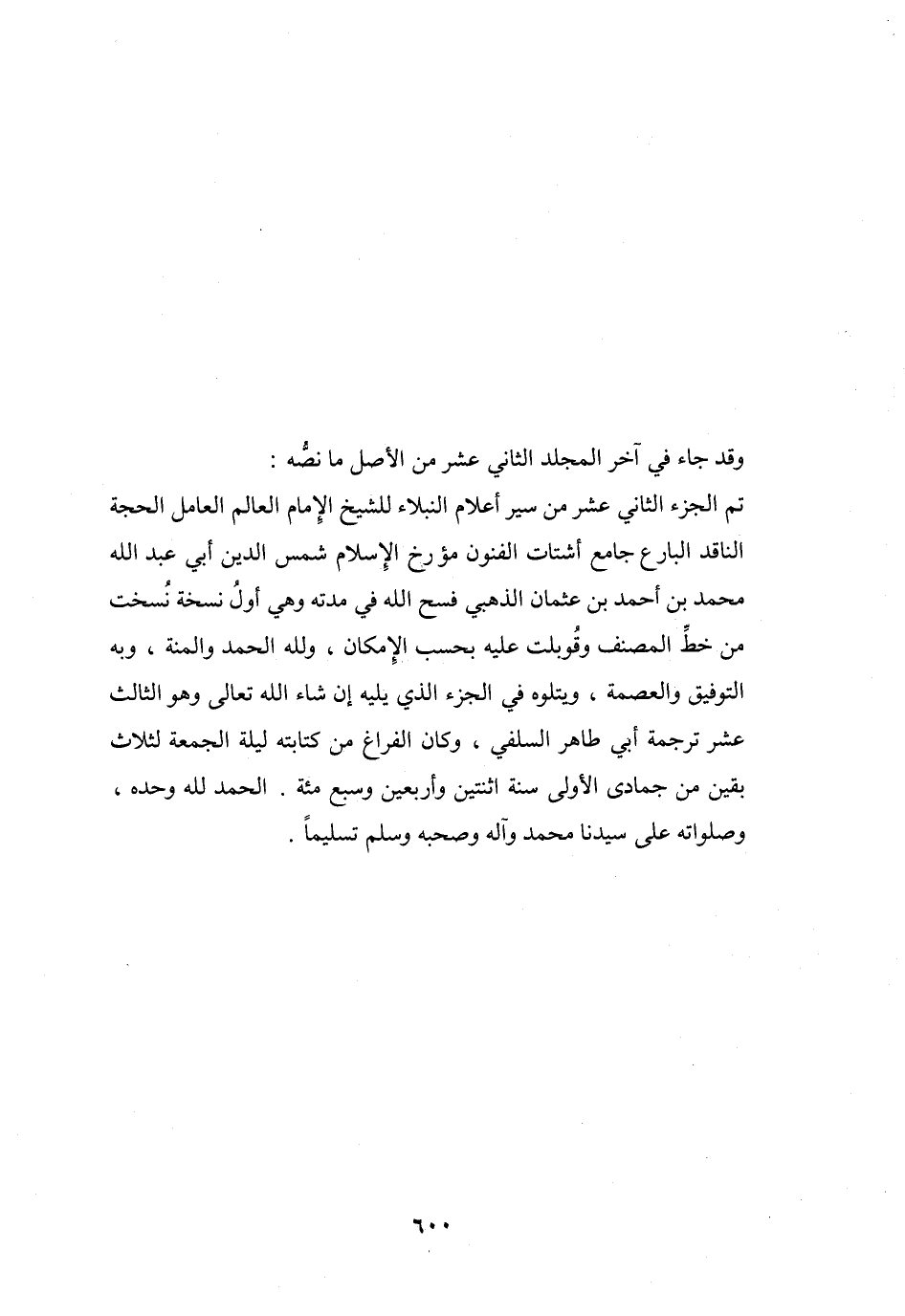 تَمَّ الجزءُ الثَّانِي عَشرَ مِن (سِيَرْ أَعْلاَمِ النُّبَلاَءِ) لِلشَّيخِ الإِمامِ العالمِ العاملِ الحجَّةِ النَّاقدِ البارعِ جَامعِ أَشتاتِ الفُنونِ مُؤرِّخِ الإسلامِ شَمسِ الدِّينِ أَبِي عَبدِ اللهِ مُحَمَّدِ بنِ أَحْمَدَ بنِ عُثْمَانَ الذَّهَبِيِّ فَسَحَ اللهُ فِي مُدَّتِه، وَهِي أوَّلُ نُسخةٍ نُسختْ مِن خَطِّ المُصنِّفِ وقُوبلَتْ عَلَيْهِ بِحسبِ الإِمكانِ، وَللهِ الحمدُ والمِنَّةُ، وَبِه التَّوفِيقُ والعِصمةُ، وَيَتلُوه فِي الجُزءِ الَّذي يَلِيهِ - إنْ شاءَ اللهُ تَعَالَى - وَهُوَ الثَّالثَ عَشَرَ تَرجَمةُ أَبِي طَاهرٍ السِّلَفِيِّ، وكانَ الفَراغُ مِن كِتَابَتِه لَيلةَ الجُمعةِ، لِثَلاثٍ بَقِينَ مِن جُمادى الأُولى، سَنةَ اثنَتَيْنِ وأَربَعِينَ وسَبعِ مائةٍ.