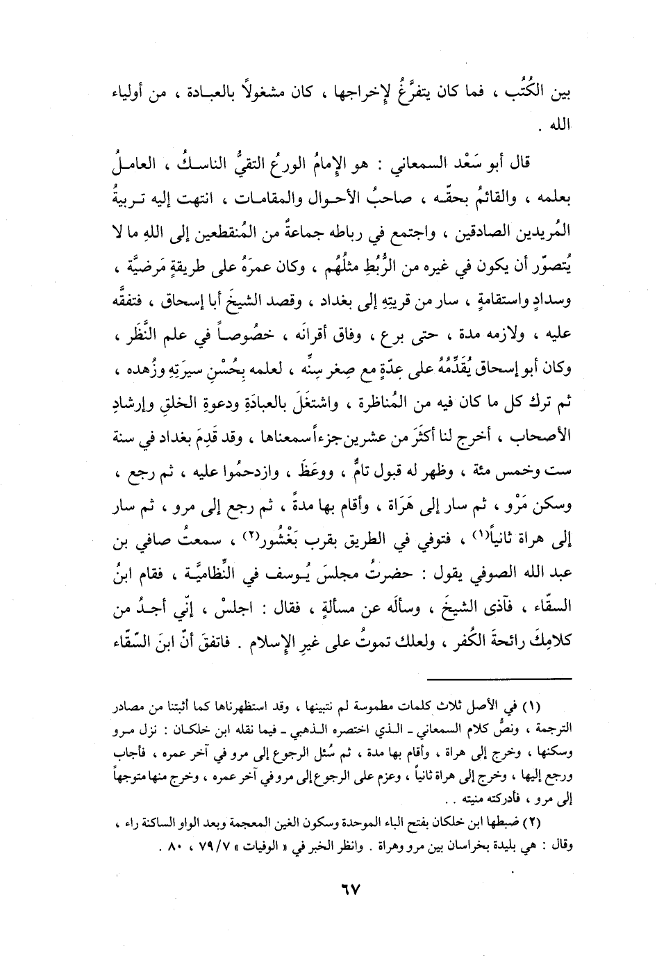 (1) في الأصل ثلاث كلمات مطموسة لم نتبينها، وقد استظهرناها كما أثبتنا من مصادر الترجمة، ونص كلام السمعاني - الذي اختصره الذهبي - فيما نقله ابن خلكان: نزل مرو وسكنها، وخرج إلى هراة، وأقام بها مدة، ثم سئل الرجوع إلى مرو في آخر عمره، فأجاب ورجع إليها، وخرج إلى هراة ثانيا، وعزم على الرجوع إلى مرو في آخر عمره، وخرج منها متوجها إلى مرو، فأدركته منيته.