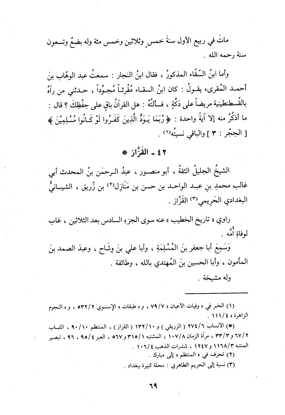 (*) الأنساب 6 / 274 (الزريقي) و10 / 132 (القزاز) ، المنتظم 10 / 90، اللباب 2 / 67 و3 / 33، مرآة الزمان 8 / 107، المشتبه 1 / 315 و567، العبر 4 / 95، 96، تبصير المنتبه 3 / 1168 و1247، شذرات الذهب 4 / 106.