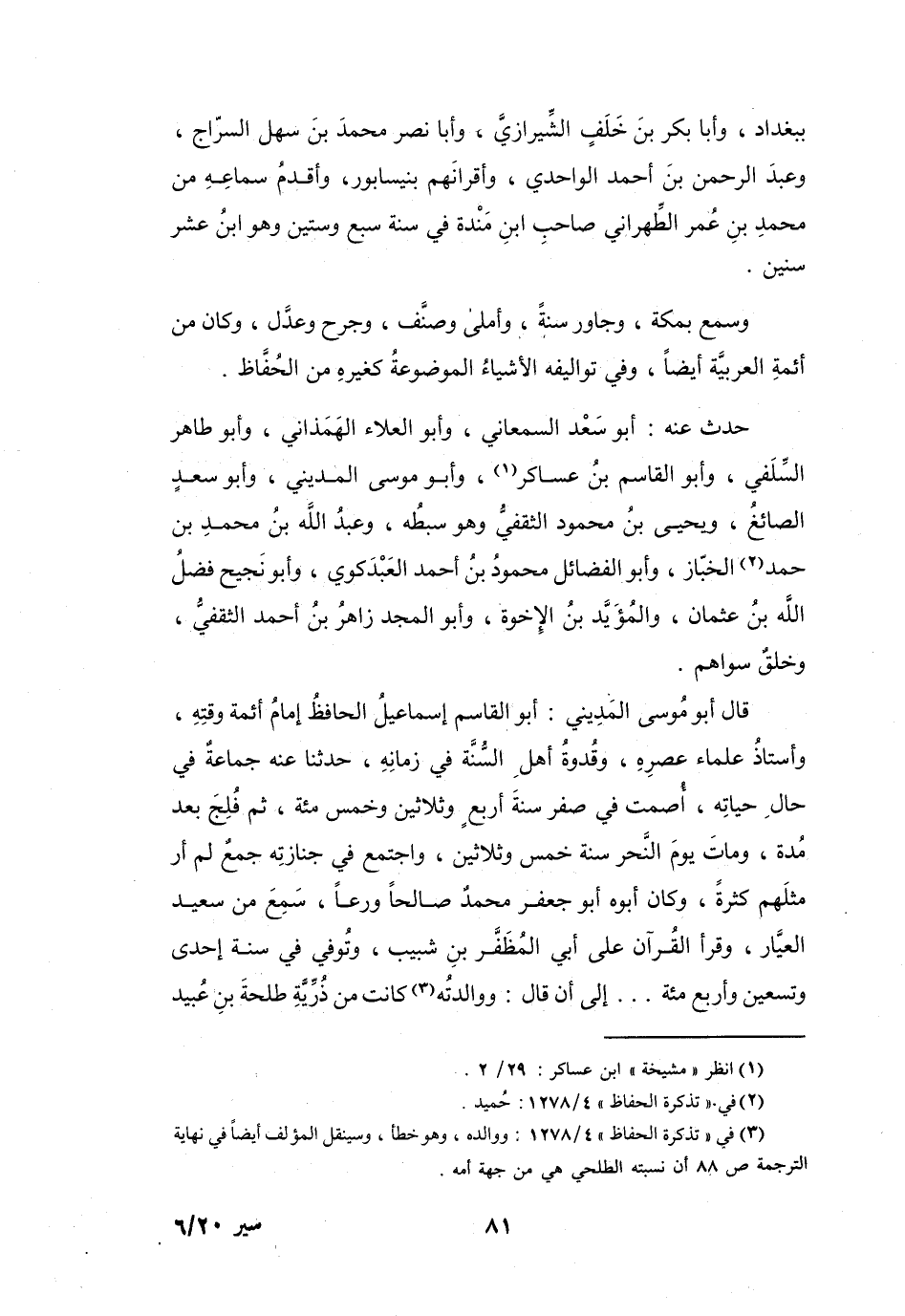 (3) في " تذكرة الحفاظ " 4 / 1278: ووالده، وهو خطأ، وسينقل المؤلف أيضا في نهاية الترجمة ص 88 أن نسبته الطلحي هي من جهة أمه.