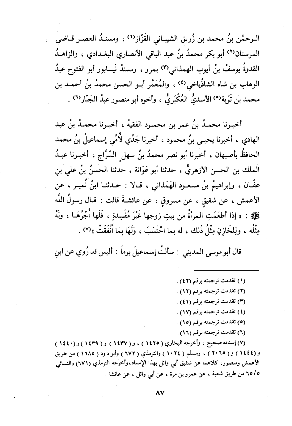 أَخْبَرَنَا مُحَمَّدُ بنُ عُمَرَ بنِ مَحْمُوْدٍ الفَقِيْهُ، أَخْبَرَنَا مُحَمَّدُ بنُ عَبْدِ الهَادِي، أَخْبَرَنَا يَحْيَى بنُ مَحْمُوْدٍ، أَخْبَرَنَا جَدِّي لأُمِّي؛ إِسْمَاعِيْلُ بنُ مُحَمَّدٍ الحَافِظُ بِأَصْبَهَانَ، أَخْبَرَنَا أَبُو نَصْرٍ مُحَمَّدُ بنُ سَهْلٍ السَّرَّاجُ، أَخْبَرَنَا عَبْدُ المَلِكِ بنُ الحَسَنِ الأَزْهَرِيُّ، حَدَّثَنَا أَبُو عَوَانَةَ، حَدَّثَنَا الحَسَنُ بنُ عَلِيِّ بنِ عَفَّانَ، وَإِبْرَاهِيْمُ بنُ مَسْعُوْدٍ الهَمَذَانِيُّ، قَالاَ: