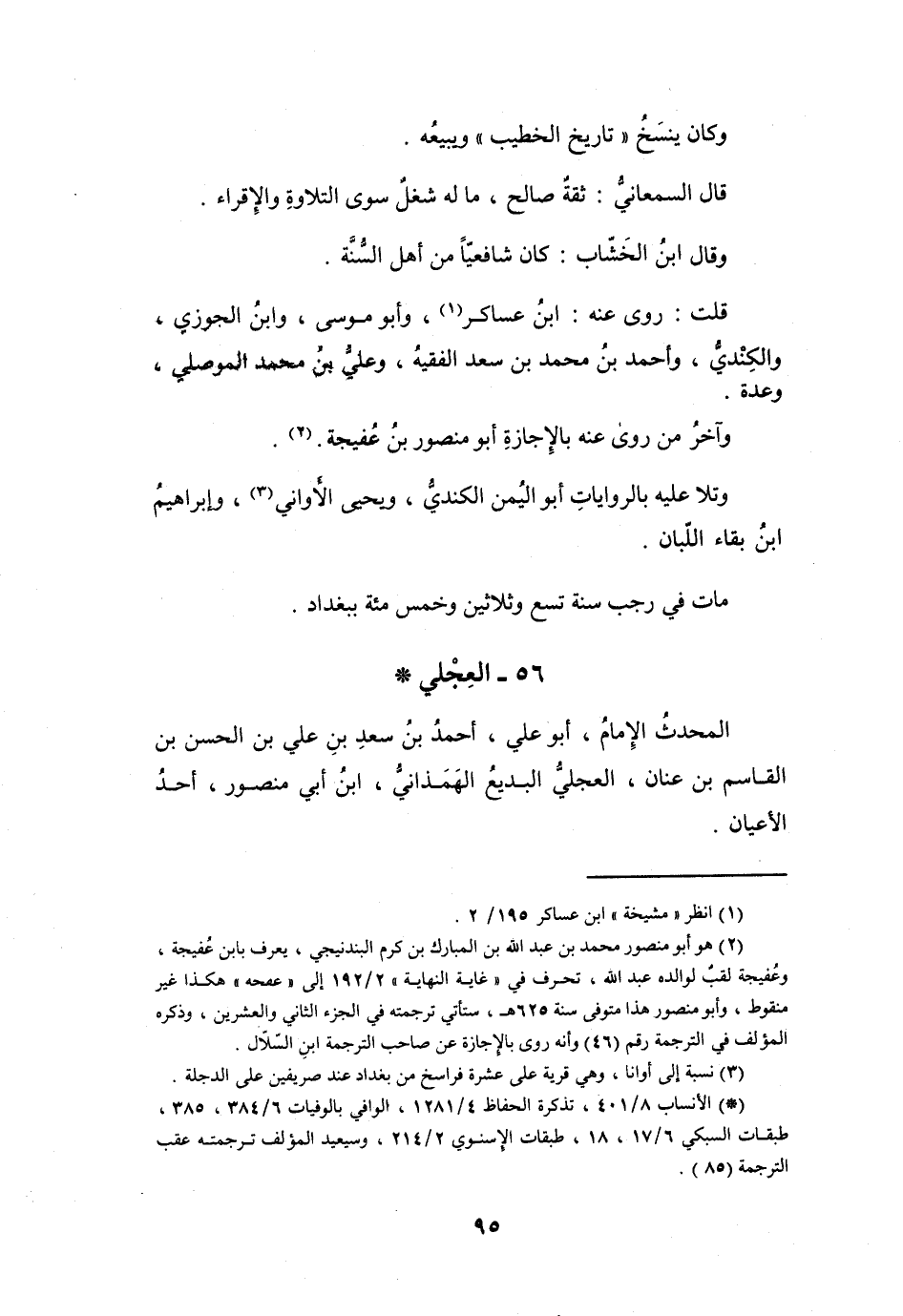(2) هو أبو منصور محمد بن عبد الله بن المبارك بن كرم البندنيجي، يعرف بابن عفيجة، وعفيجة لقب لوالده عبد الله، تحرف في " غاية النهاية " 2 / 192 إلى " عفحه " هكذا غير منقوط، وأبو منصور هذا متوفى سنة 625 هـ، ستأتي ترجمته في الجزء الثاني والعشرين، وذكره المؤلف في الترجمة رقم (46) وأنه روى بالاجازة عن صاحب الترجمة ابن السلال.