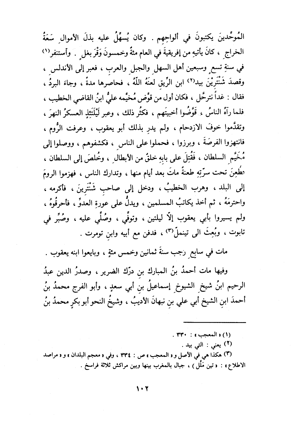 (3) هكذا هي في الأصل و (المعجب) ص: 334، وفي (معجم البلدان) و (مراصد الاطلاع) : (تين ملل) ، جبال بالمغرب بينها وبين مراكش ثلاثة فراسخ.