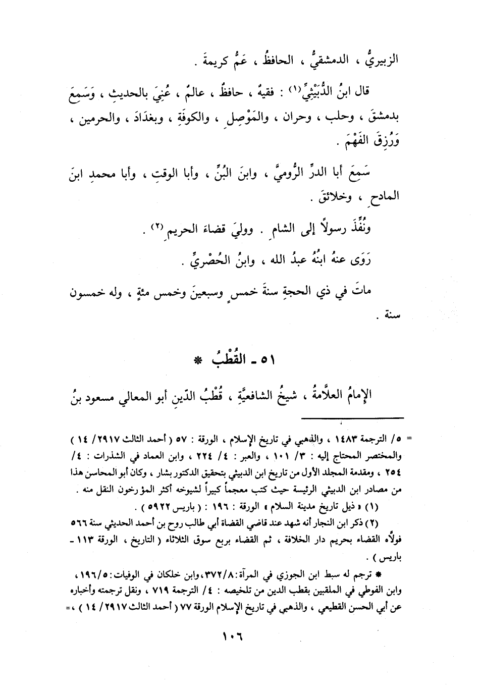 (*) ترجم له سبط ابن الجوزي في المرآة 8 / 372، وابن خلكان في الوفيات: 5 / 196، وابن الفوطي في الملقبين بقطب الدين من تلخيصه: 4 / الترجمة 719، ونقل ترجمته وأخباره عن أبي الحسن القطيعي، والذهبي في تاريخ الإسلام الورقة 77 (أحمد الثالث 2917 / 14) ، =