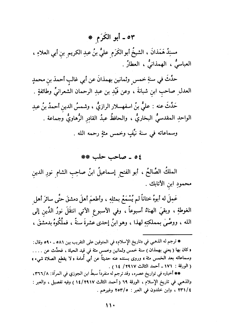 (*) ترجم له الذهبي في (تاريخ الإسلام) في المتوفين على التقريب بين 581 - 590 وقال: (كان بها (يعني بهمذان) سنة خمس وثمانين وخمس مئة في قيد الحياة، فحدث عن ... وسماعاته بعد الخمس مئة) وروى بسنده عنه حديثا عن أبي أمامة (لا يقطع الصلاة شيء) (الورقة: 171 - أحمد الثالث 2917 / 14) .