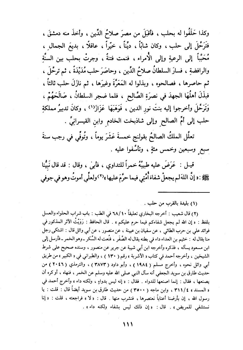 وَكَذَا حلفُوا لَهُ بِحَلَبَ، فَأَقْبَل مِنْ مِصْرَ صَلاَح الدِّيْنِ، وَأَخَذَ مِنْهُ دِمَشْق، فَترحّل إِلَى حلب، وَكَانَ شَابّاً، دَيِّناً، خَيّراً، عَاقِلاً، بَدِيْع الْجمال، محبَّباً إِلَى الرَّعِيَّةِ وَإِلَى الأُمَرَاءِ، فَنمت فِتْنَةٌ، وَجَرَتْ بِحَلَبَ بَيْنَ السّنَّة وَالرَّافِضَّة، فَسَارَ السُّلْطَان صَلاَح الدِّيْنِ، وَحَاصَرَ حلب مُدَيْدَة، ثُمَّ ترحّل، ثُمَّ حَاصرهَا، فَصَالَحُوْهُ، وَبذلُوا لَهُ المَعَرَّة وَغَيْرهَا، ثُمَّ نَازل حلب ثَالِثاً، فَبذل أَهْلهَا الْجهد فِي نُصْرَة الصَّالِح، فَلَمَّا ضَجر السُّلْطَان، صَالِحهُم، وَترحّل، وَأَخْرَجُوا إِلَيْهِ بِنْت نُوْر الدِّيْنِ، فَوَهَبهَا عَزَازَ (1) ، وَكَانَ تدبِير مَمْلَكَة حلب إِلَى أُمّ الصَّالِح وَإِلَى شَاذبخت الخَادِم وَابْن القَيْسَرَانِيّ.