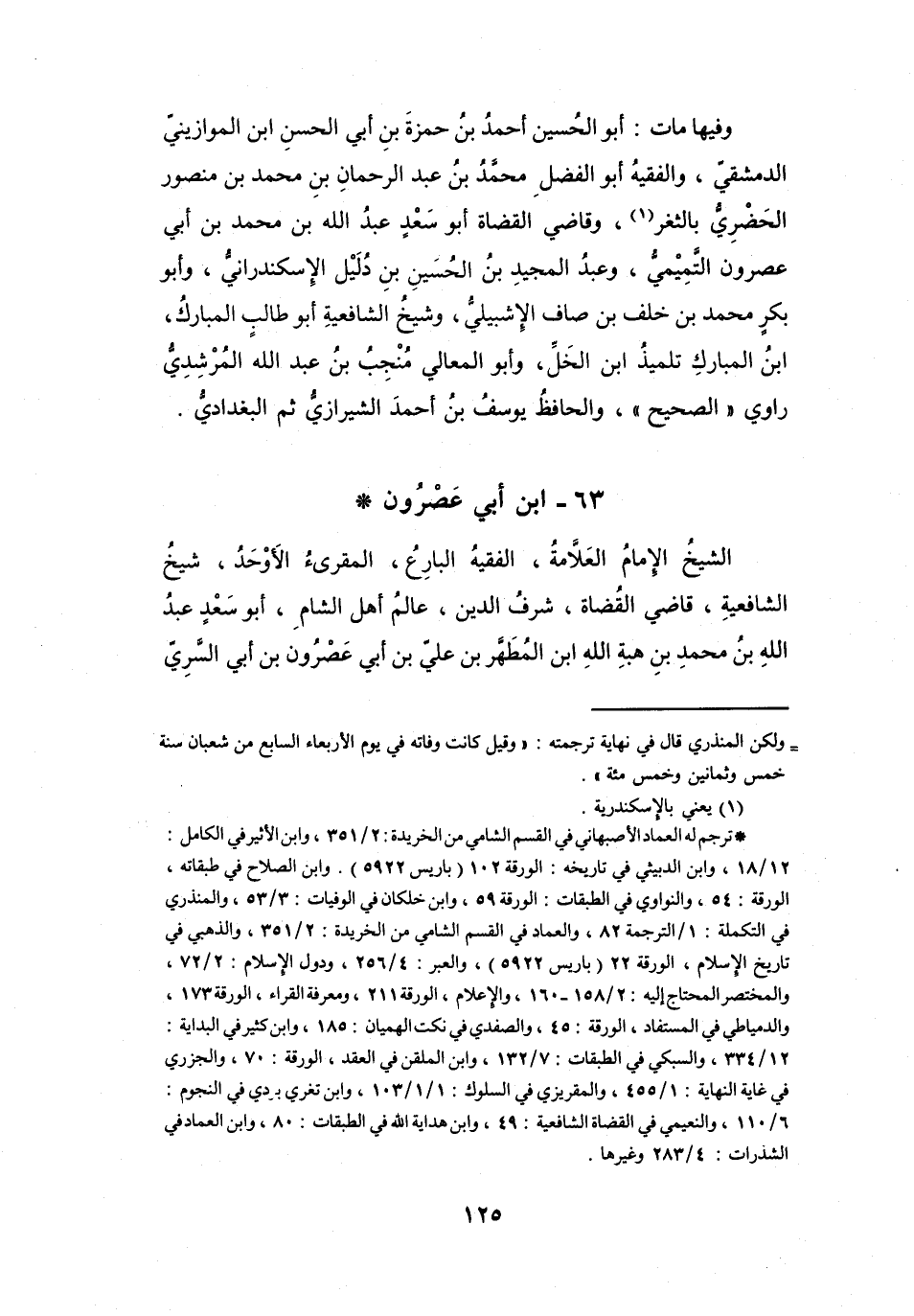 (*) ترجم له العماد الأصبهاني في القسم الشامي من الخريدة: 2 / 351، وابن الأثير في الكامل: 12 / 18، وابن الدبيثي في تاريخه: الورقة 102 (باريس 5922) ، وابن الصلاح في طبقاته، الورقة: 54، والنواوي في الطبقات: الورقة 59، وابن خلكان في الوفيات: 3 / 53، والمنذري في التكملة: 1 / الترجمة 82، والعماد في القسم الشامي من الخريدة: 2 / 351، والذهبي في تاريخ الإسلام، الورقة 22 (باريس 5922) ، والعبر: 4 / 256، ودول الإسلام: 2 / 72، والمختصر المحتاج إليه: 2 / 158 - 160، والاعلام، الورقة 211، ومعرفة القراء، الورقة 173، والدمياطي في المستفاد، الورقة: 45، والصفدي في نكت الهميان: 185، وابن كثير في البداية: 12 / 334، والسبكي في الطبقات: 7 / 132، وابن الملقن في العقد، الورقة: 70، والجزري في غاية النهاية: 1 / 455، والمقريزي في السلوك: 1 / 1 / 103، وابن تغري بردي في النجوم: 6 / 110، والنعيمي في القضاة الشافعية: 49، وابن هداية الله في الطبقات: 80، وابن العماد في الشذرات: 4 / 283 وغيرها.