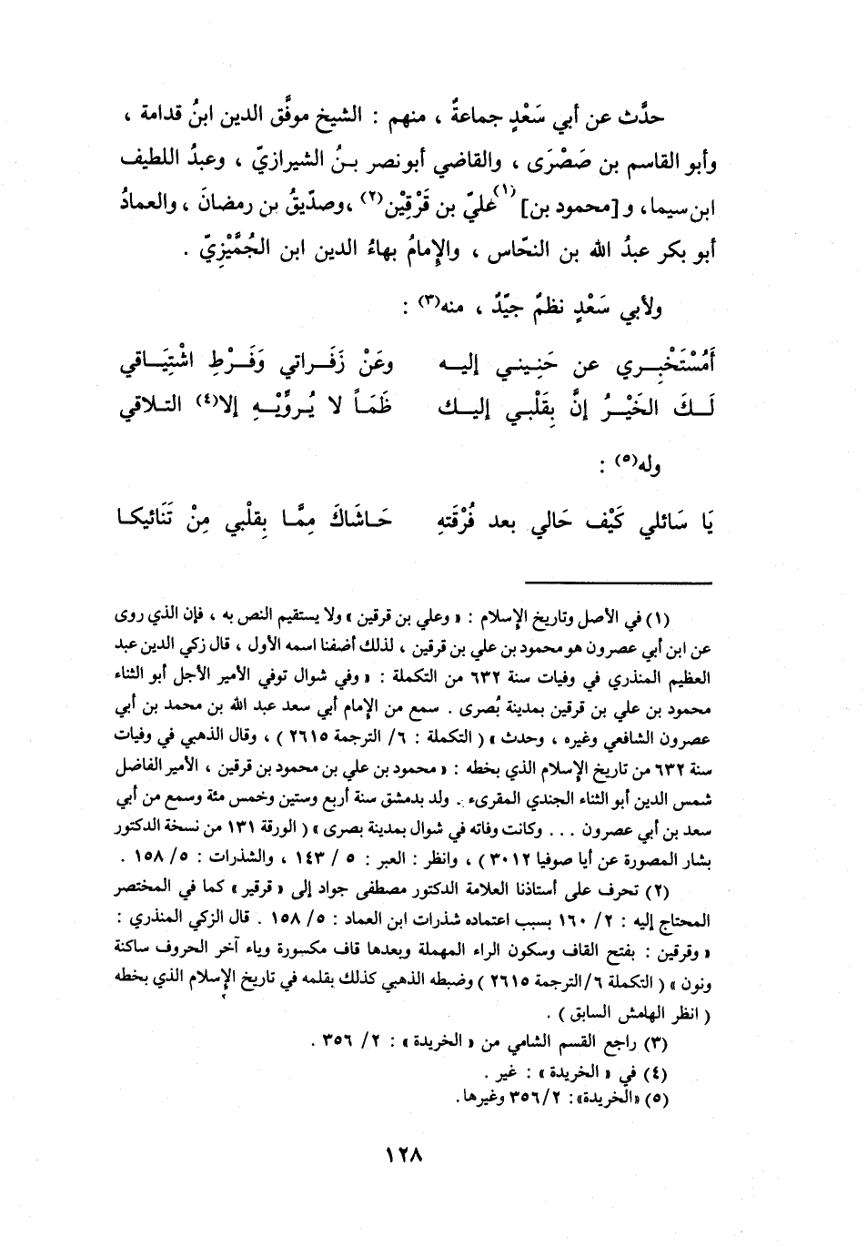 (1) في الأصل وتاريخ الإسلام: (وعلي بن قرقين) ولا يستقيم النص به، فإن الذي روى عن ابن أبي عصرون هو محمود بن علي بن قرقين، لذلك أضفنا اسمه الأول، قال زكي الدين عبد العظيم المنذري في وفيات سنة 632 من التكملة: (وفي شوال توفي الأمير الاجل أبو الثناء محمود بن علي بن قرقين بمدينة بصرى.