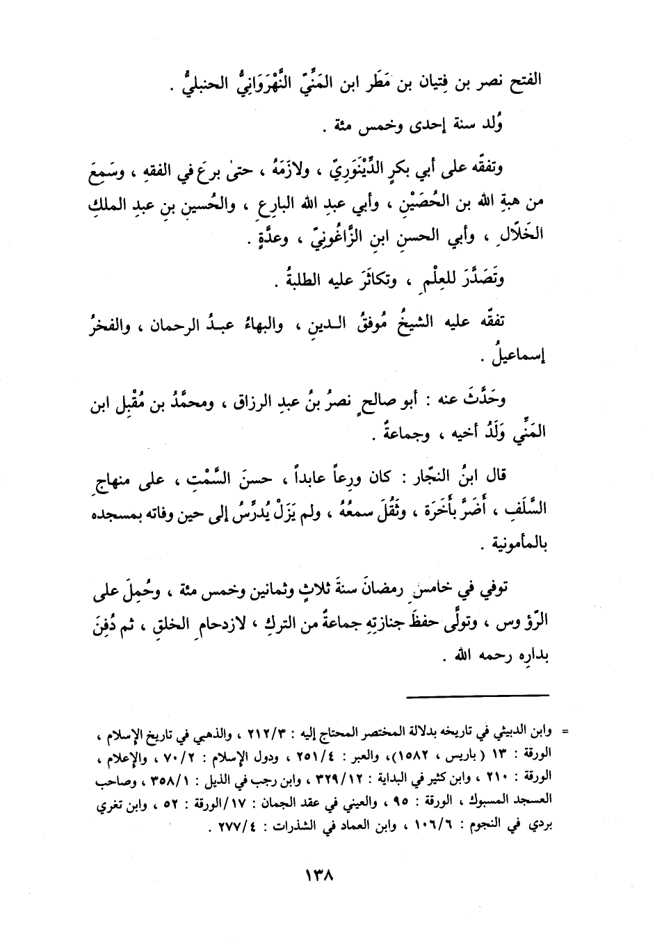 الفَتْحِ نَصْرُ بنُ فِتْيَانَ بنِ مَطَرِ ابْنِ المنِّيِّ النُّهْرُوَانِيُّ، الحَنْبَلِيُّ.