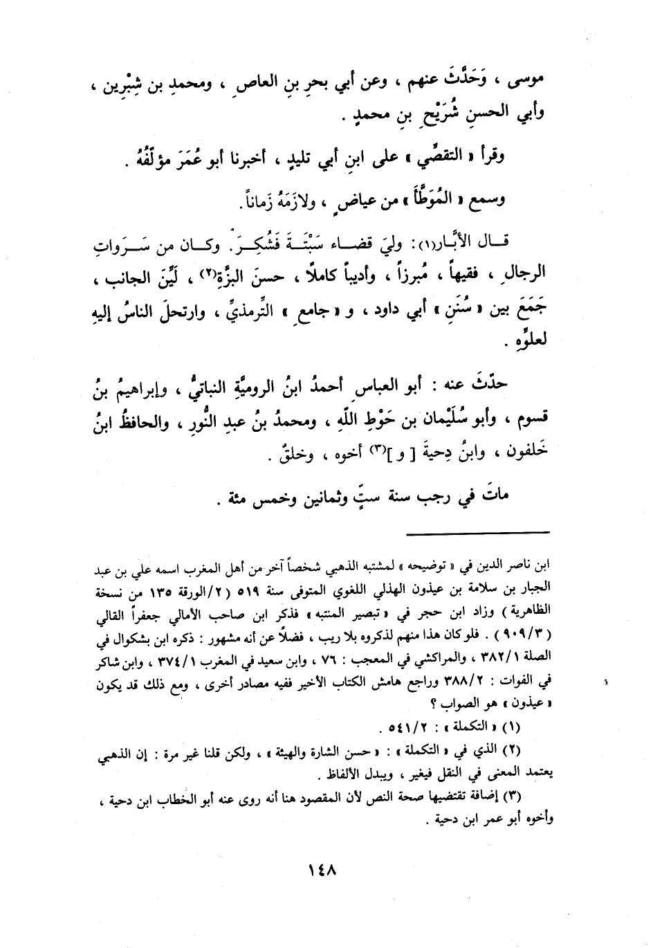 قَالَ الأَبَّار (1) : وَلِيَ قَضَاءَ سَبْتَة، فَشُكر، وَكَانَ مِنْ سروَات الرِّجَال، فَقِيهاً، مُبرّزاً، وَأَديباً كَامِلاً، حسن البزَّة (2) ، ليّن الجَانب، جمع بَيْنَ (سُنَن أَبِي دَاوُدَ) ، وَ (جَامِع التِّرْمِذِيّ) ، وَارْتَحَلَ النَّاس إِلَيْهِ لعلُوْه.
