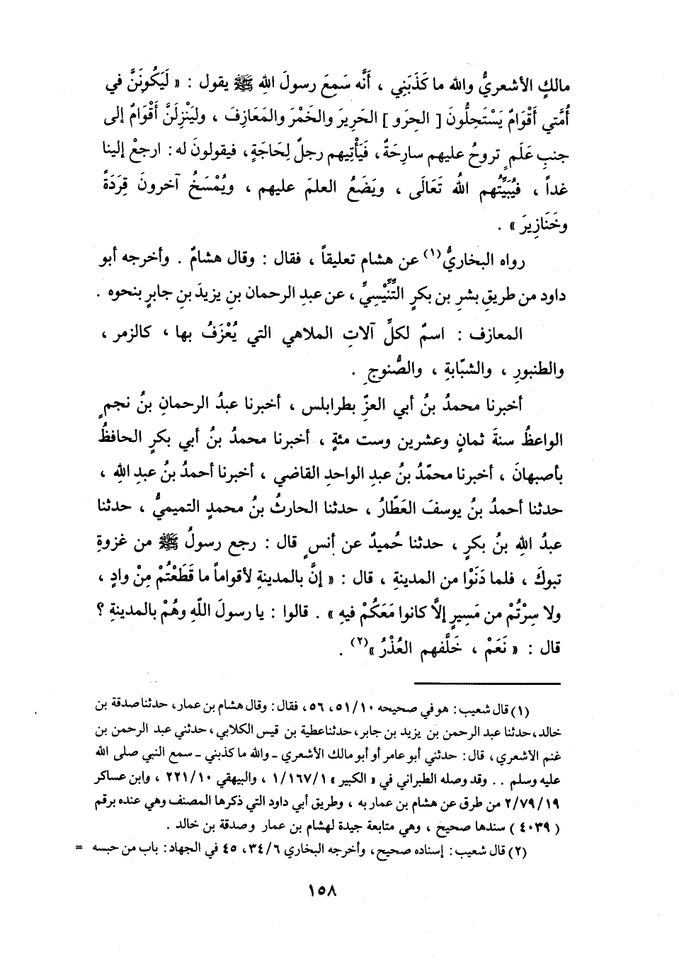 أَنَّهُ سَمِعَ رَسُوْل اللهِ -صَلَّى اللَّهُ عَلَيْهِ وَسَلَّمَ- يَقُوْلُ: (لَيَكُوْنَنَّ فِي أُمَّتِي أَقْوَامٌ يَسْتَحِلُّوْنَ الحِرَ وَالحَرِيْرَ وَالخَمْرَ وَالمَعَازِفَ، وَلَيَنْزِلَنَّ أَقْوَامٌ إِلَى جَنْبِ عَلَمٍ تَرُوْحُ عَلَيْهِم سَارِحَةٌ، فَيَأْتِيْهِم رَجُلٌ لِحَاجَةٍ، فَيَقُوْلُوْنَ لَهُ: ارْجِعْ إِلَيْنَا غَداً، فَيُبَيِّتُهُمُ اللهُ -تَعَالَى- وَيَضَعُ العِلْمَ عَلَيْهِم، وَيُمْسَخُ آخَرُوْنَ قِرَدَةً وَخَنَازِيْرَ) .