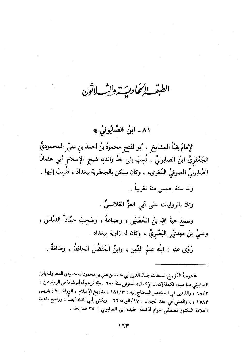 (*) هو جد المؤرخ المحدث جمال الدين أبي حامد بن علي بن محمود المحمودي المعروف بابن الصابوني صاحب (تكملة إكمال الإكمال) المتوفى سنة 680.