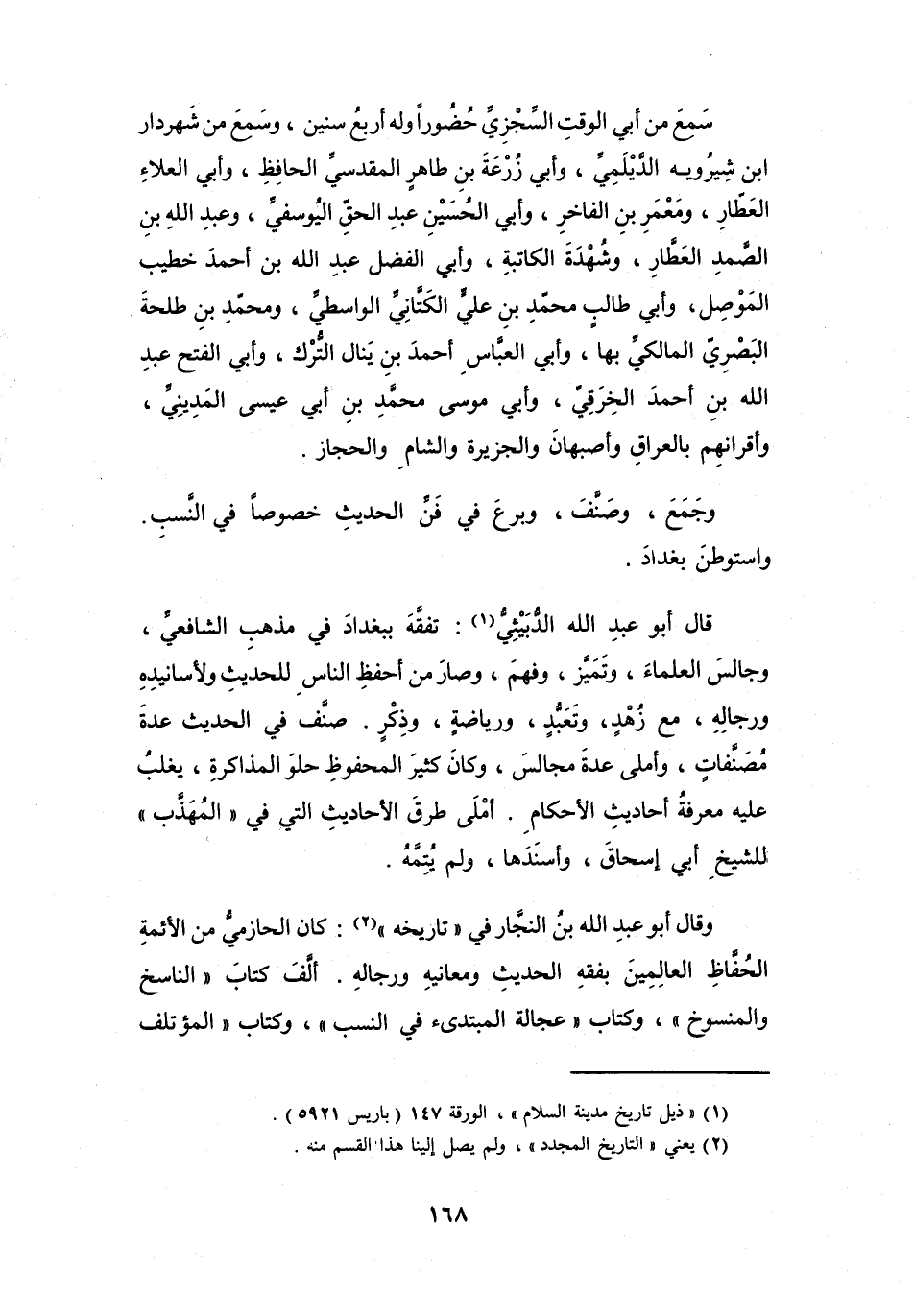 وَقَالَ أَبُو عَبْدِ اللهِ بنُ النَّجَّار فِي (تَارِيْخِهِ (2)) : كَانَ الحَازِمِيُّ مِنَ الأَئِمَّةِ الحُفَّاظ، العَالِمِين بِفقه الحَدِيْث وَمعَانِيه وَرِجَاله، أَلّف كِتَاب (النَّاسخ وَالمَنْسُوْخ) ، وَكِتَاب (عجَالَة الْمُبْتَدِئ فِي النَّسَبِ) ، وَكِتَاب (المُؤتلف