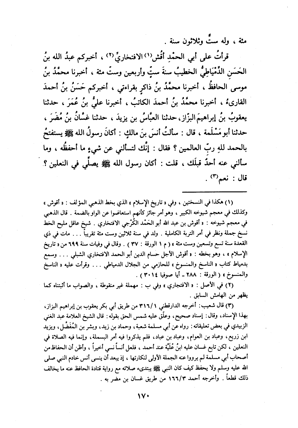 (3) قال شعيب: أخرجه الدارقطني 1 / 316 من طريق أبي بكر يعقوب بن إبراهيم البزاز، بهذا الإسناد، وقال: إسناد صحيح، وعلق عليه شمس الحق بقوله: قال الشيخ العلامة عبد الغني الزبيدي في بعض تعليقاته: رواه عن أبي مسلمة شعبة، وحماد بن زيد، وبشر بن المفضل، ويزيد ابن زريع، وعباد بن العوام، وعباد بن عباد، فلم يذكروا فيه أمر البسملة، وإنما فيه الصلاة في النعلين، لكن تابع غسان عليه ابن علية عند أحمد، فلعل أنسا نسي أخيرا، وأظن أن الحفاظ من أصحاب أبي مسلمة لم يرووا عنه الجملة الأولى لنكارتها، إذ يبعد أن ينسى أنس خادم النبي صلى الله عليه وسلم ولا يحفظ كيف كان النبي صلى الله عليه وسلم يبتدئ صلاته مع رواية قتادة الحافظ عنه ما يخالف