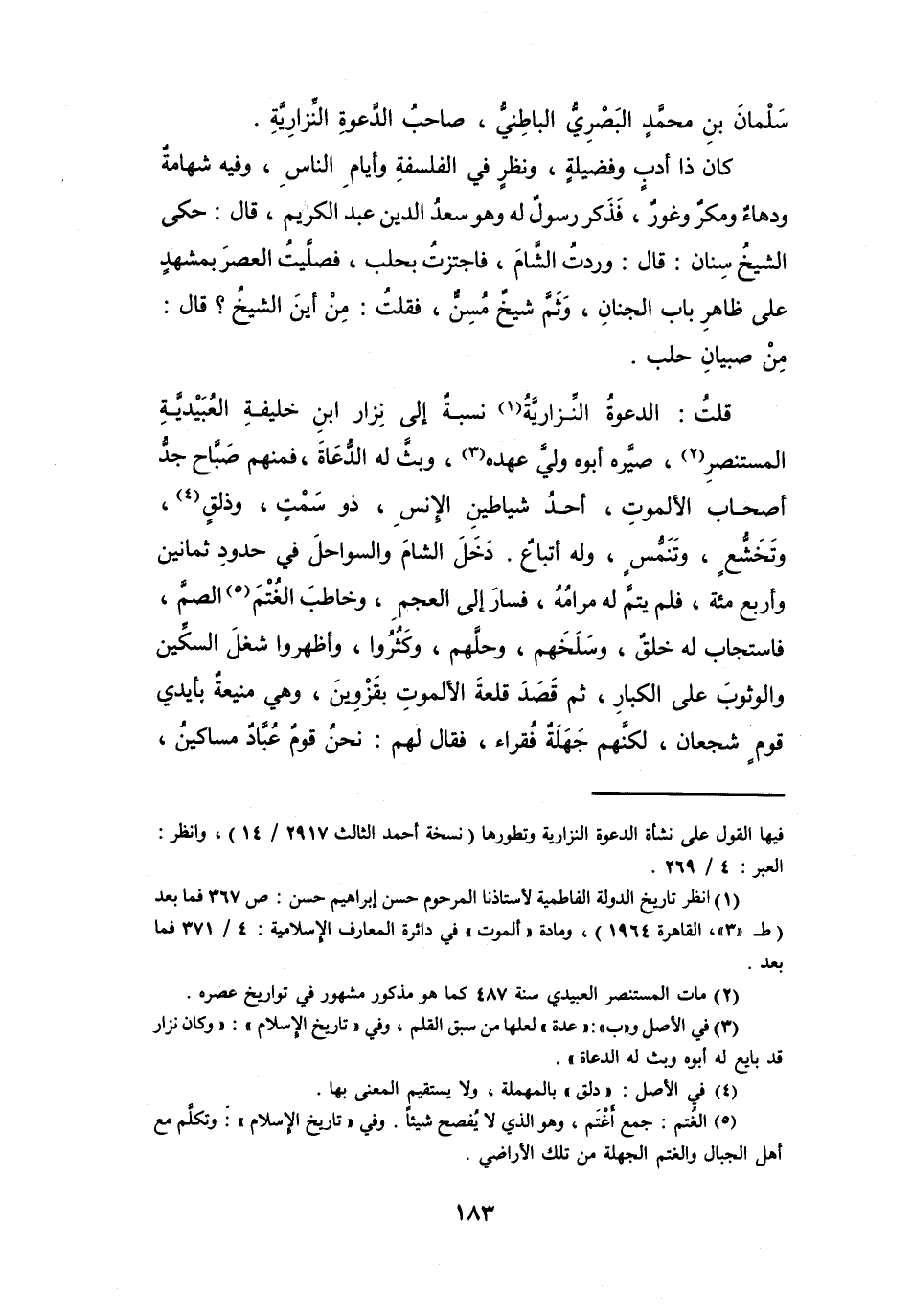 قُلْتُ: الدَّعوَةُ النِّزَارِيَّةُ (1) نسبَةٌ إِلَى نزَارِ ابْنِ خَلِيْفَة العُبَيْدِيَّةِ المُسْتَنْصِرِ (2) ، صَيَّرَهُ أَبُوْهُ وَلِيَّ عَهْدِهِ (3) ، وَبثَّ لَهُ الدُّعَاةَ، فَمنهُم صَبَّاحٌ جدُّ أَصْحَابِ الْأَلْمُوتِ، أَحَدُ شيَاطينِ الإِنْسِ، ذُو سَمْتٍ، وَذلقٍ (4) ، وَتَخَشُّعٍ، وَتنَمُّسٍ، وَلَهُ أَتْبَاعٌ.