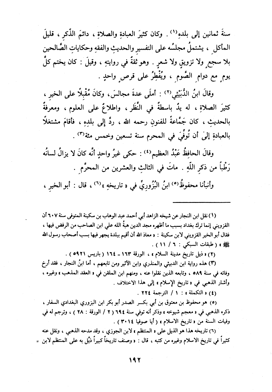 (6) تاريخه هذا هو الذيل على (المنتظم) لابن الجوزي، وقد مدحه الذهبي، ونقل عنه كثيرا في تاريخ الإسلام وغيره من كتبه، قال: (وصنف تاريخا كبيرا ذيل به على المنتظم لابن =