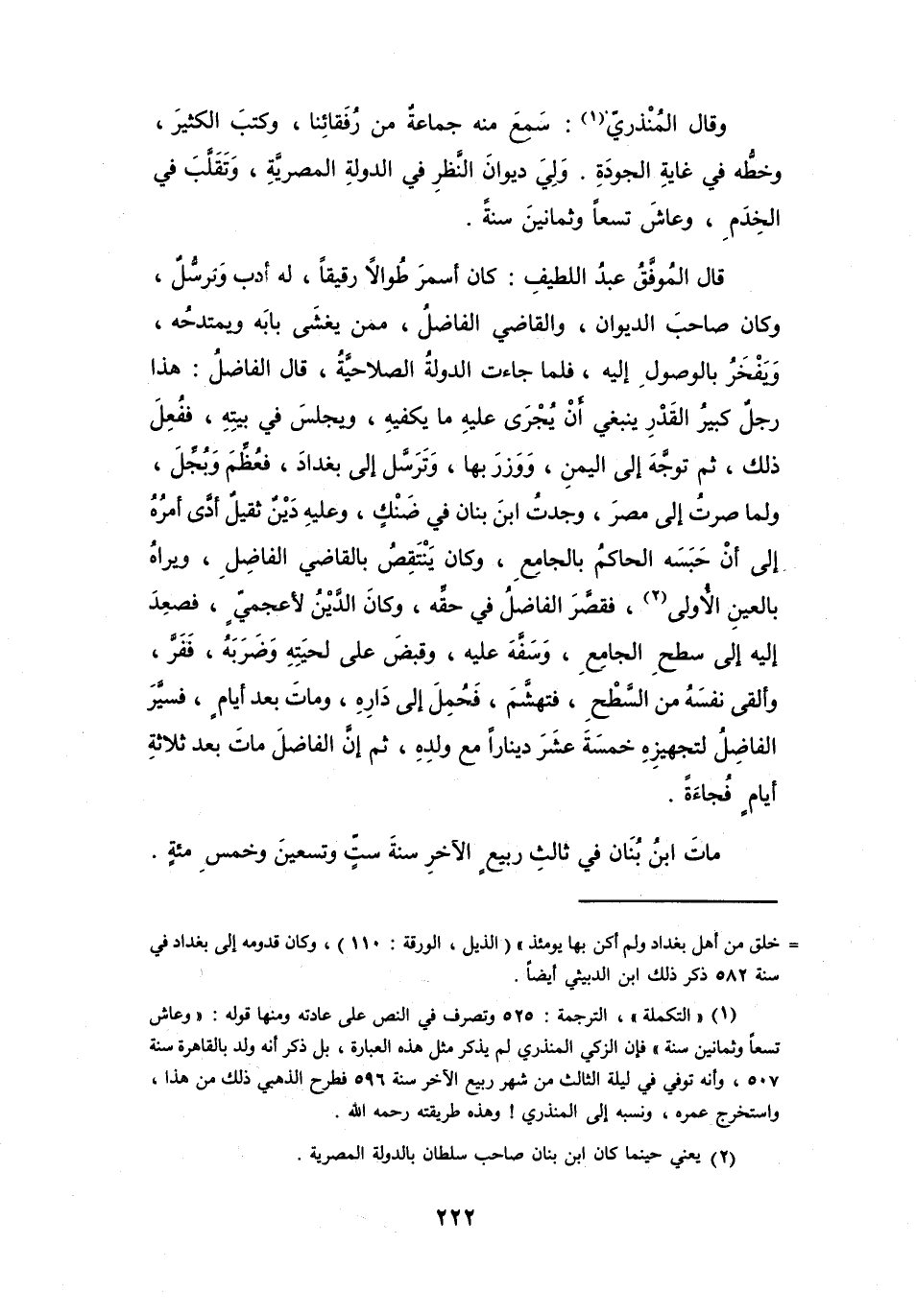 فَفُعَل ذَلِكَ، ثُمَّ تَوجّه إِلَى اليَمَنِ، وَوزر بِهَا، وَترسّل إِلَى بَغْدَادَ، فَعظّم، وَبجّل، وَلَمَّا صرت إِلَى مِصْرَ، وَجَدْت ابْنَ بُنَانٍ فِي ضَنْك، وَعَلَيْهِ دَيْن ثَقِيل، أَدَّى أَمره إِلَى أَنْ حَبسه الحَاكِم بِالجَامِع، وَكَانَ يَنْتقص بِالقَاضِي الفَاضِل، وَيَرَاهُ بِالعين الأُوْلَى (2) ، فَقَصَّر الفَاضِل فِي حقّه، وَكَانَ الدَّيْن لأَعْجَمِيّ، فَصَعِدَ إِلَيْهِ إِلَى سطح الجَامِع، وَسفّه عَلَيْهِ، وَقبض عَلَى لِحْيته وَضَرَبَه، فَفَرّ، وَأَلقَى نَفْسه مِنَ السّطح، فَتهشّم، فَحُمِلَ إِلَى دَارِهِ، وَمَاتَ بَعْدَ أَيَّام، فَسيّر الفَاضِل لِتجهيزه خَمْسَةَ عَشَرَ دِيْنَاراً مَعَ وَلده، ثُمَّ إِنَّ الفَاضِل مَاتَ بَعْدَ ثَلاَثَة أَيَّام فُجَاءةً.