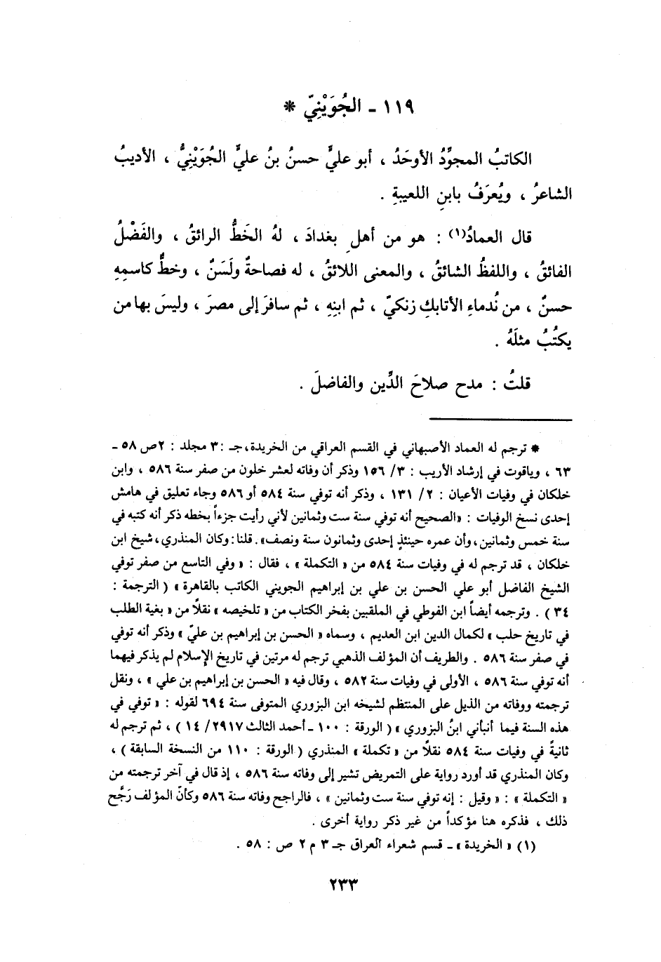 قَالَ العِمَاد (1) : هُوَ مِنْ أَهْلِ بَغْدَاد، لَهُ الخطُّ الرَّائِق، وَالفَضْل الفَائِق، وَاللَّفْظ الشَّائِق، وَالمَعْنَى اللاَئِق، لَهُ فَصَاحَةٌ وَلَسَن، وَخطّ كَاسْمِهِ حسنٌ، مِنْ نُدمَاء الأَتَابكِ زَنْكِي، ثُمَّ ابْنه، ثُمَّ سَافر إِلَى مِصْرَ، وَلَيْسَ بِهَا مَنْ يَكتب مِثْله.