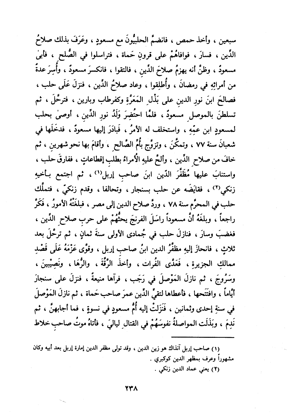سَبْعِيْنَ، وَأَخَذَ حِمْص، فَانضمّ الحلبيّون مَعَ مَسْعُوْد، وَعَرَفَ بِذَلِكَ صَلاَح الدِّيْنِ، فَسَارَ، فَوَافَاهُم عَلَى قرُوْنَ حَمَاة، فَترَاسلُوا فِي الصُّلح، فَأَبَى مَسْعُوْد، وَظَنّ أَنَّهُ يهْزم صَلاَح الدِّيْنِ، فَالتَقَوا، فَانكسر مَسْعُوْد، وَأُسِرَ عِدَّة مِنْ أُمَرَائِهِ فِي رَمَضَانَ، وَأُطلقُوا، وَعَاد صَلاَح الدِّيْنِ، فَنَزَلَ عَلَى حلب، فَصَالَحَ ابْن نُوْر الدِّيْنِ عَلَى بذل المَعَرَّة وَكفرطَاب وَبَارِيْنَ، فَترحّل، ثُمَّ تَسَلَّطن بِالمَوْصِل مَسْعُوْد، فَلَمَّا احتُضر وَلد نُوْر الدِّيْنِ، أَوْصَى بِحَلَبَ لمَسْعُوْد ابْن عَمِّهِ، وَاسْتخلف لَهُ الأَمْرُ، فَبَادر إِلَيْهَا مَسْعُوْد، فَدَخَلهَا فِي شَعْبَان سَنَةَ 77، وَتَمَكَّنَ، وَتَزَوَّجَ بِأُمِّ الصَّالِح، وَأَقَامَ بِهَا نَحْو شَهْرَيْنِ، ثُمَّ خَاف مِنْ صَلاَح الدِّيْنِ، وَأَلحّ عَلَيْهِ الأُمَرَاء بِطَلب إِقطَاعَات، فَفَارق حلب، وَاستنَاب عَلَيْهَا مُظَفَّرَ الدِّيْنِ ابْن صَاحِب إِرْبِل (1) ، ثُمَّ اجْتمع بِأَخِيْهِ زَنْكِي (2) ، فَقَايضه عَلَى حلب بِسِنْجَار، وَتحَالفَا، وَقَدِمَ زَنْكِي، فَتملّك حلب فِي المُحَرَّم سَنَةَ 78، وَردّ صَلاَح الدِّيْنِ إِلَى مِصْرَ، فَبلغَتْهُ الأُمُوْر، فَكرّ رَاجِعاً، وَبَلَغَهُ أَنّ مسعُوْداً رَاسل الفِرنْج يَحثّهُم عَلَى حَرْب صَلاَح الدِّيْنِ، فَغَضِبَ وَسَارَ، فَنَازل حلب فِي جُمَادَى الأُوْلَى سَنَةَ ثَمَانٍ، ثُمَّ ترحّل بَعْد ثَلاَث، فَانحَاز إِلَيْهِ مُظَفَّر الدِّيْنِ ابْن صَاحِب إِرْبِل، وَقوَّى عَزْمه عَلَى قصد مَمَالِك الجَزِيْرَة، فَعدَّى الفُرَات، وَأَخَذَ الرَّقَّة، وَالرُّهَا، وَنَصِيْبِيْن، وَسَرُوج، ثُمَّ نَازل المَوْصِل فِي رَجَبٍ، فَرَآهَا منِيعَة، فَنَزَلَ عَلَى سِنْجَار أَيَّاماً، وَافْتَتَحَهَا، فَأَعْطَاهَا لِتقِيّ الدِّيْنِ عُمَر صَاحِب حَمَاة، ثُمَّ نَازل المَوْصِل فِي سَنَةِ إِحْدَى وَثَمَانِيْنَ، فَنَزَلت إِلَيْهِ أُمّ مَسْعُوْد فِي نِسْوَة، فَمَا أَجَابهنّ، ثُمَّ نَدِم، وَبذلت الموَاصِلَةُ نُفُوْسهُم فِي القِتَال ليَالِي، فَأَتَاهُ مَوْتُ صَاحِب خِلاَط