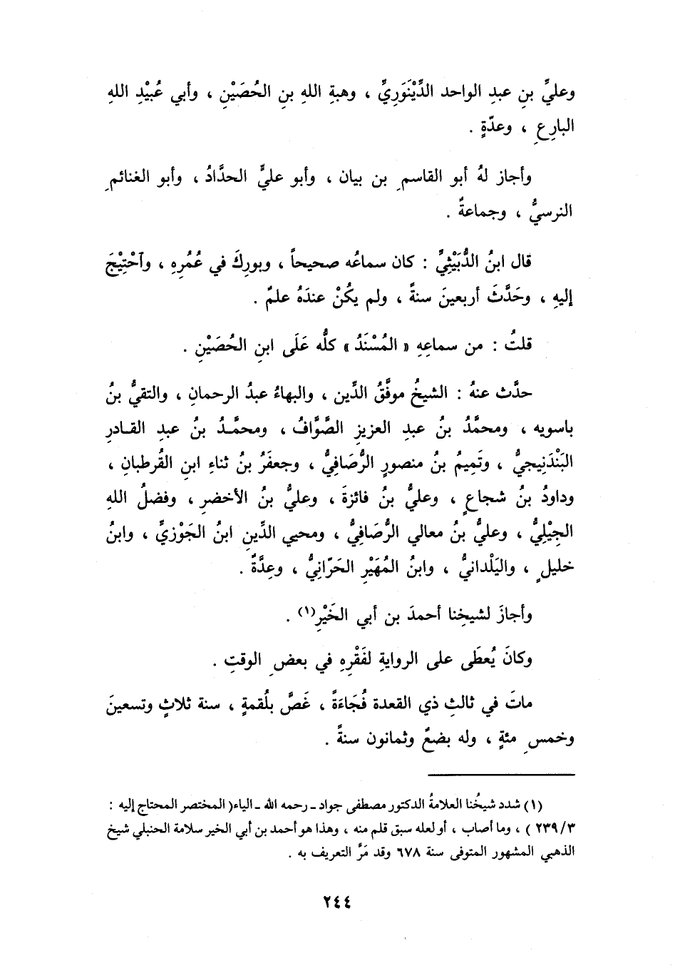 (1) شدد شيخنا العلامة الدكتور مصطفى جواد - رحمه الله - الياء (المختصر المحتاج إليه: 3 / 239) ، وما أصاب، أو لعله سبق قلم منه، وهذا هو أحمد بن أبي الخير سلامة الحنبلي شيخ الذهبي المشهور المتوفى سنة 678 وقد مر التعريف به.