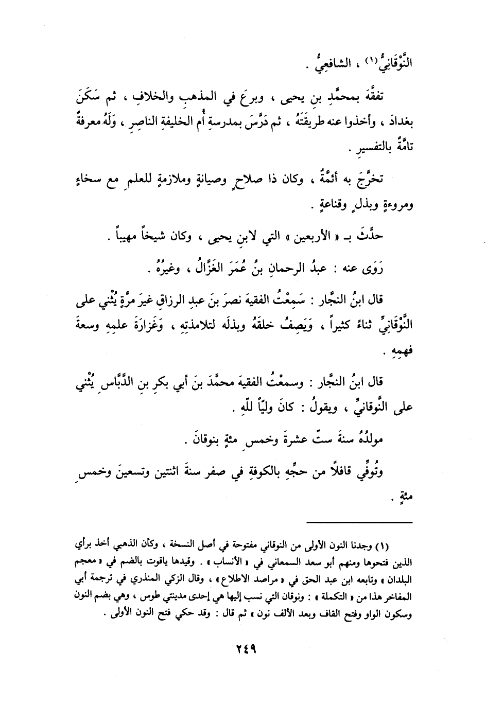 (1) وجدنا النون الأولى من النوقاني مفتوحة في أصل النسخة، وكأن الذهبي أخذ برأي الذين فتحوها ومنهم أبو سعد السمعاني في (الأنساب) .