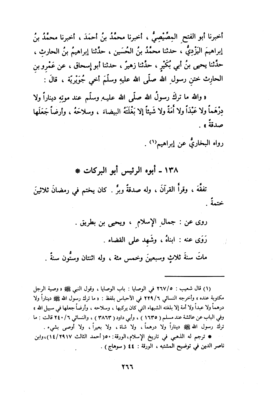 (1) قال شعيب: 5 / 267 في الوصايا: باب الوصايا، وقول النبي صلى الله عليه وسلم (وصية الرجل مكتوبة عنده) وأخرجه النسائي 6 / 229 في الاحباس بلفظ: (ما ترك رسول الله صلى الله عليه وسلم دينارا ولا درهما ولا عبدا ولا أمة إلا بغلته الشهباء التي كان يركبها، وسلاحه، وأرضا جعلها في سبيل الله) وفي الباب عن عائشة عند مسلم (1635) ، وأبي داود (3863) ، والنسائي 6 / 240 قالت: ما ترك رسول الله صلى الله عليه وسلم دينارا ولا درهما، ولا شاة، ولا بعيرا، ولا أوصى بشيء.