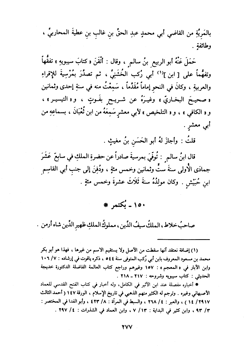 (1) إضافة نعتقد أنها سقطت من الأصل ولا يستقيم الاسم من غيرها، فهذا هو أبو بكر محمد بن مسعود المعروف بابن أبي ركب المتوفى سنة 544، ذكره ياقوت في إرشاده: 7 / 106 وابن الابار في (المعجم) : 157 وغيرهم وراجع كتاب العالمة الفاضلة الدكتورة خديجة الحديثي: كتاب سيبويه وشروحه: 217 - 218.