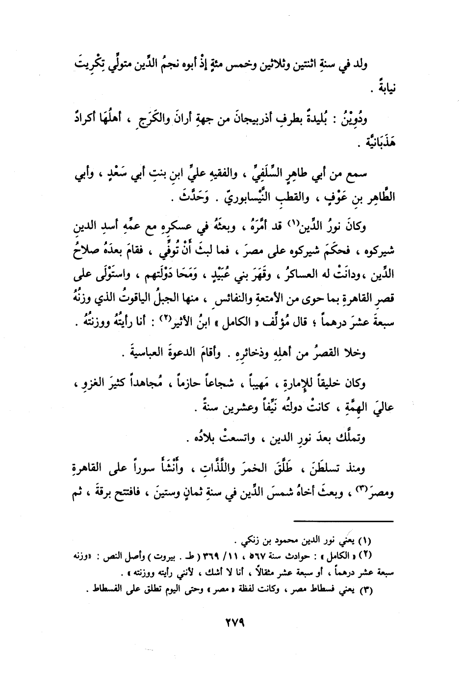 وَكَانَ نُوْر الدِّيْنِ (1) قَدْ أَمَّرَه، وَبعثَه فِي عَسْكَره مَعَ عَمّه أَسَد الدِّيْنِ شِيرْكُوْه، فَحكم شِيرْكُوْه عَلَى مِصْرَ، فَمَا لَبِثَ أَنْ تُوُفِّيَ، فَقَامَ بَعْدَهُ صَلاَح الدِّيْنِ، وَدَانت لَهُ العَسَاكِر، وَقهر بنِي عُبَيْد، وَمحَا دَوْلَتهُم، وَاسْتَوْلَى عَلَى قَصْر القَاهِرَة بِمَا حوَى مِنَ الأَمتعَة وَالنّفَائِس، مِنْهَا الْجَبَل اليَاقُوْت الَّذِي وَزنهُ سَبْعَةَ عَشَرَ دِرْهَماً؛ قَالَ مُؤلِّف (الكَامِل) ابْن الأَثِيْر (2) : أنَا رَأَيْتهُ وَوزنته.
