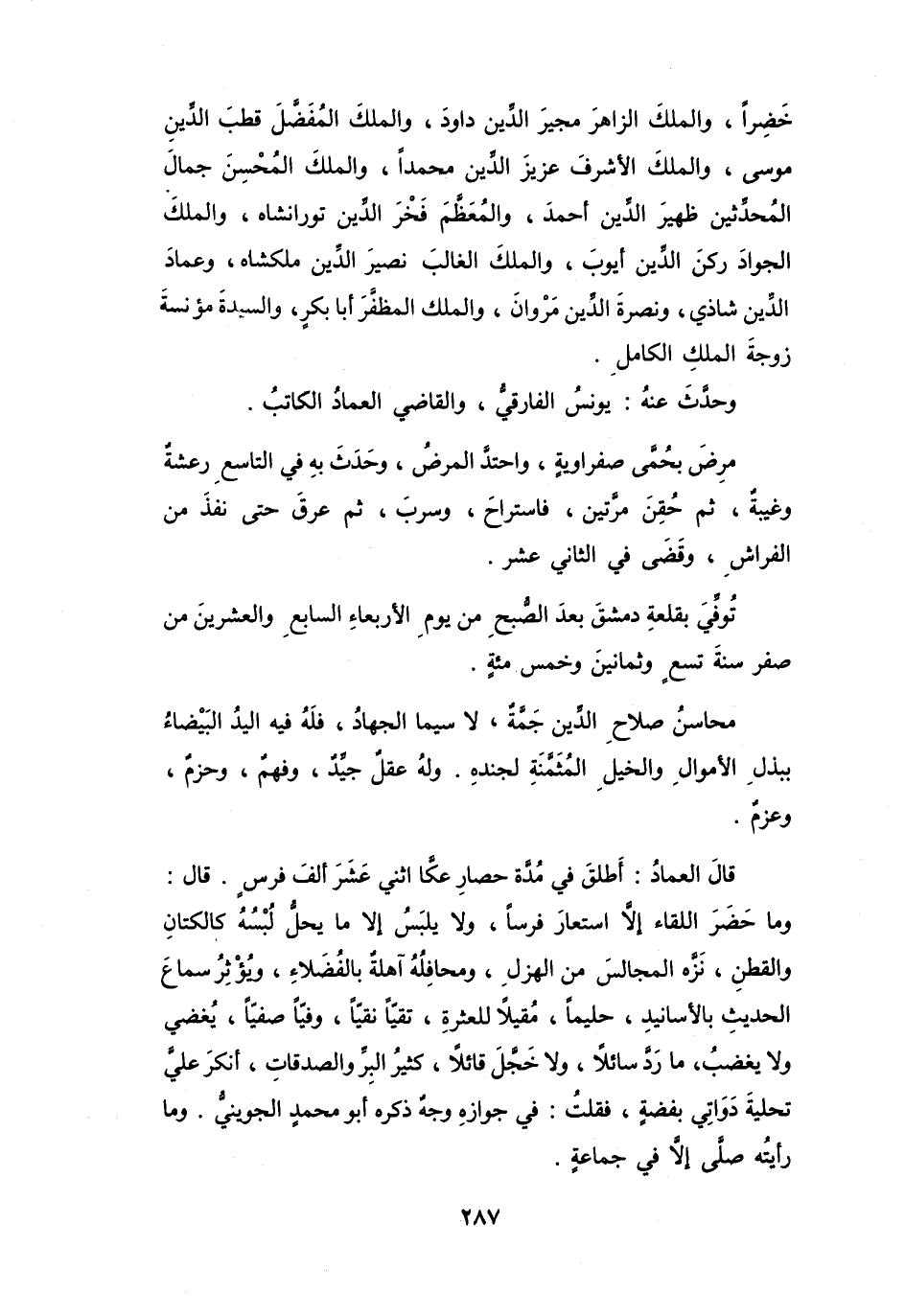 قَالَ العِمَاد: أَطلق فِي مُدَّة حِصَار عكَّا اثْنَيْ عَشَرَ أَلف فَرَس، قَالَ: وَمَا حضَر اللِّقَاء إِلاَّ اسْتَعَار فَرساً، وَلاَ يَلبس إِلاَّ مَا يَحلّ لُبْسُهُ كَالكتان وَالقطن، نَزَّه المَجَالِس مِنَ الْهزْل، وَمحَافلُهُ آهلَةٌ بِالفُضَلاَء، وَيُؤثِرُ سَمَاع الحَدِيْث بِالأَسَانِيْد، حليماً، مُقيلاً لِلْعثرَة، تَقيّاً نَقيّاً، وَفِيّاً صفِيّاً، يُغضِي وَلاَ يغضبُ، مَا ردَّ سَائِلاً، وَلاَ خجَّلَ قَائِلاً، كَثِيْرُ البِرِّ وَالصَدَقَات، أَنْكَر عليَّ تحليَةَ دوَاتِي بفِضَّة، فَقُلْتُ: فِي جَوَازه وَجهٌ ذَكَرَهُ أَبُو مُحَمَّدٍ الجُوَيْنِيّ، وَمَا رَأَيْتهُ صَلَّى إِلاَّ فِي جَمَاعَةٍ.