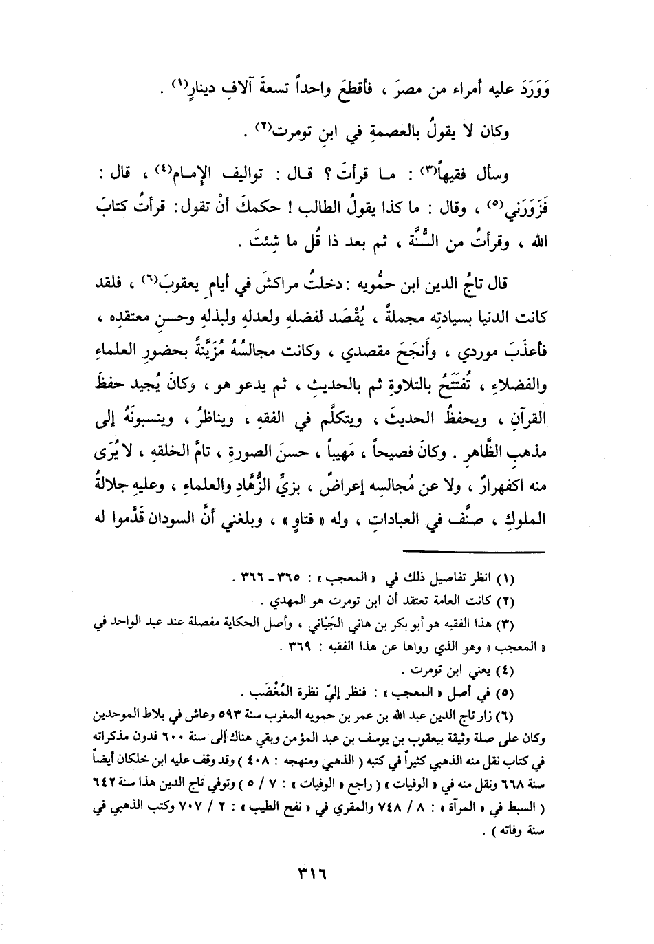 (6) زار تاج الدين عبد الله بن عمر بن حمويه المغرب سنة 593 وعاش في بلاط الموحدين وكان على صلة وثيقة بيعقوب بن يوسف بن عبد المؤمن وبقي هناك إلى سنة 600 فدون مذكراته في كتاب نقل منه الذهبي كثيرا في كتبه (الذهبي ومنهجه: 408) وقد وقف عليه ابن خلكان أيضا سنة 668 ونقل منه في (الوفيات) (راجع (الوفيات) : 7 / 5) وتوفي تاج الدين هذا سنة 642 (السبط في (المرآة) : 8 / 748 والمقري في (نفح الطيب) : 2 / 707 وكتب الذهبي في سنة وفاته) .