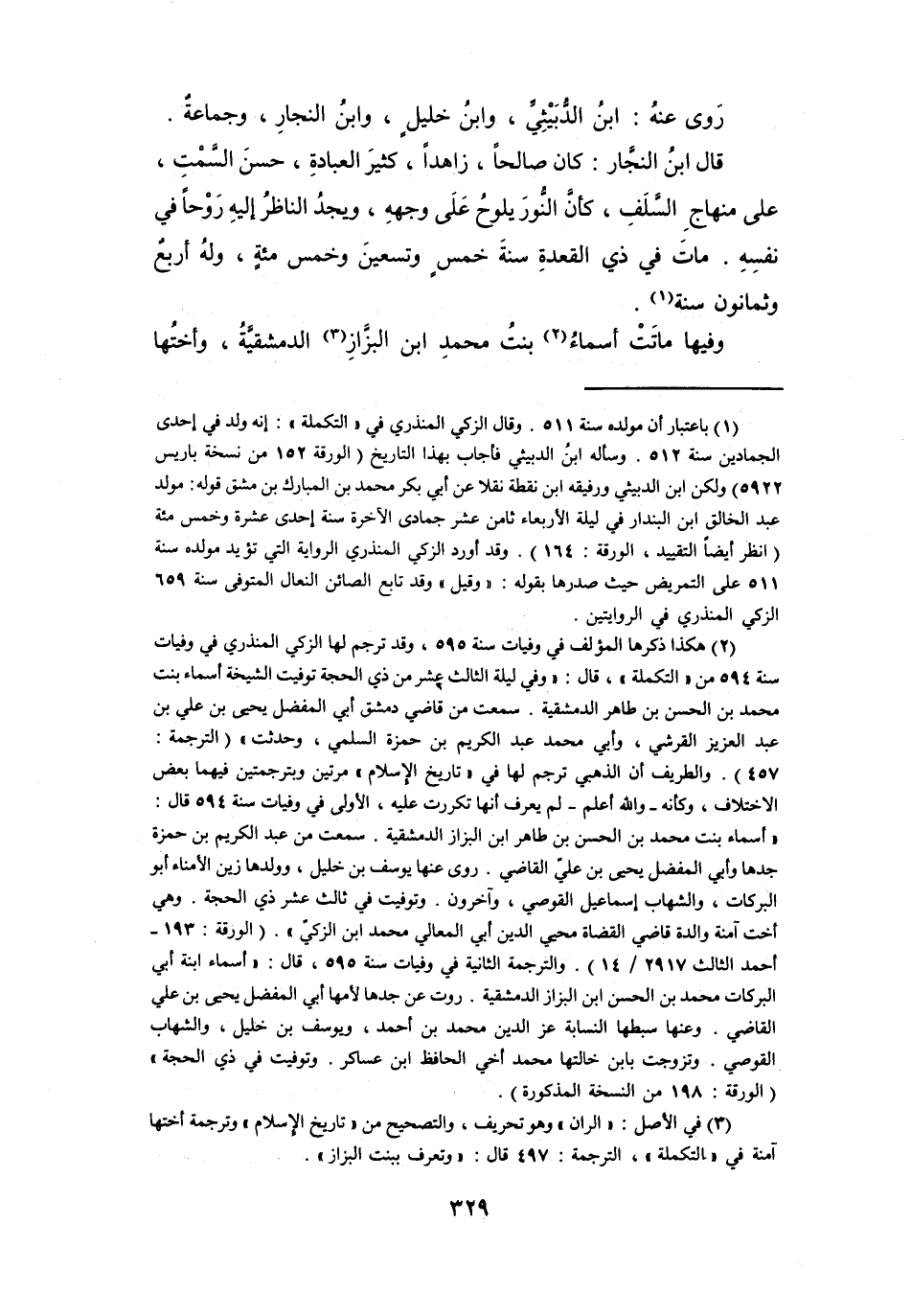 (2) هكذا ذكرها المؤلف في وفيات سنة 595، وقد ترجم لها الزكي المنذري في وفيات سنة 594 من (التكملة) ، قال: (وفي ليلة الثالث عشر من ذي الحجة توفيت الشيخة أسماء بنت محمد بن الحسن بن طاهر الدمشقية.