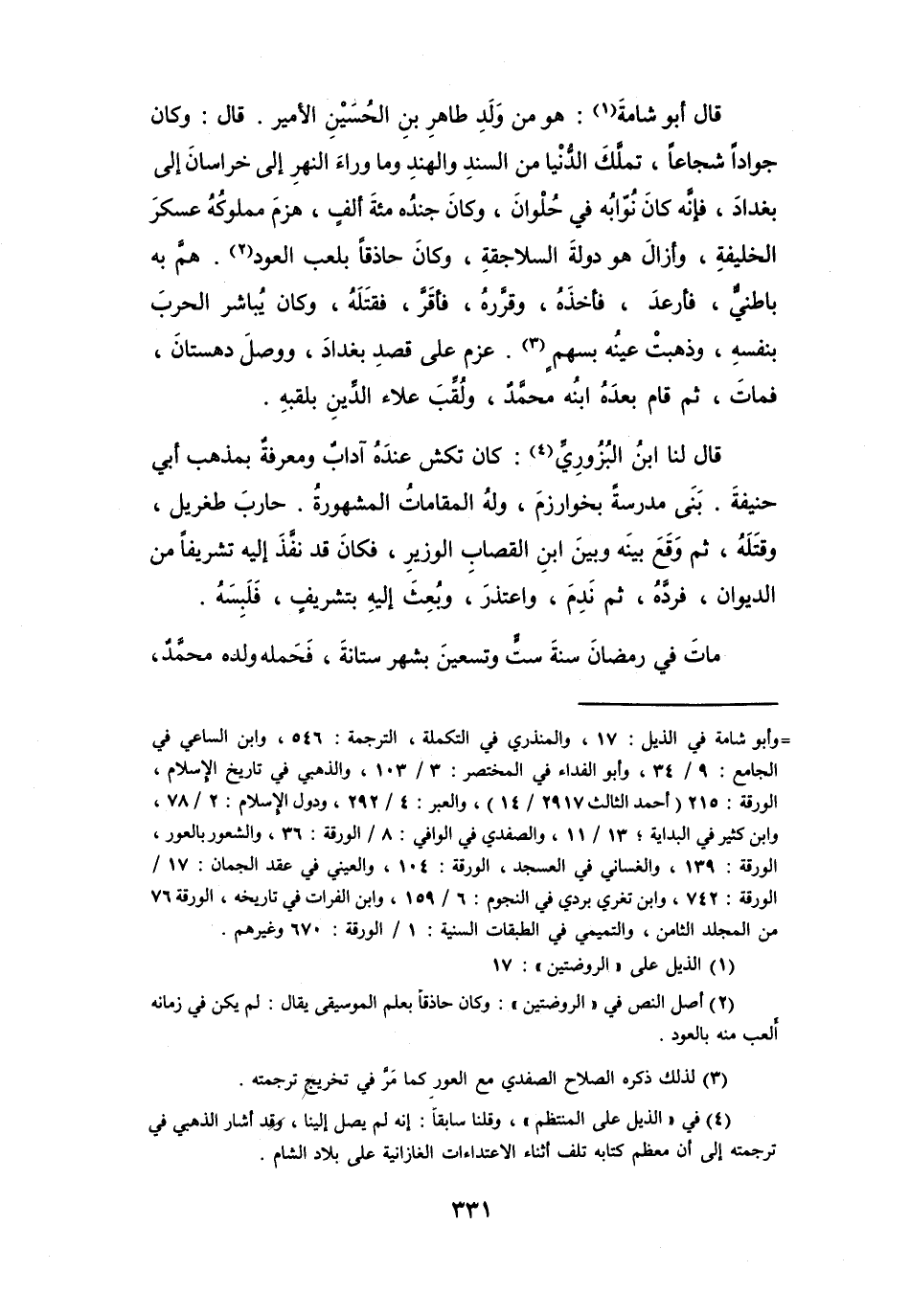 قَالَ أَبُو شَامَةَ (1) : هُوَ مِنْ وَلد طَاهِر بن الحُسَيْنِ الأَمِيْر.