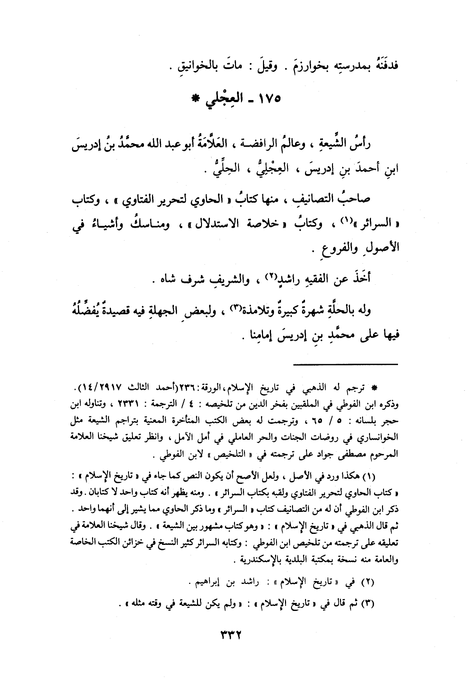 رَأْسُ الشِّيْعَةِ، وَعَالِمُ الرَّافِضَّةِ، العَلاَّمَةُ، أَبُو عَبْدِ اللهِ مُحَمَّدُ بنُ إِدْرِيْسَ بنِ أَحْمَدَ بنِ إِدْرِيْسَ العِجْلِيُّ، الحِلِّيُّ.