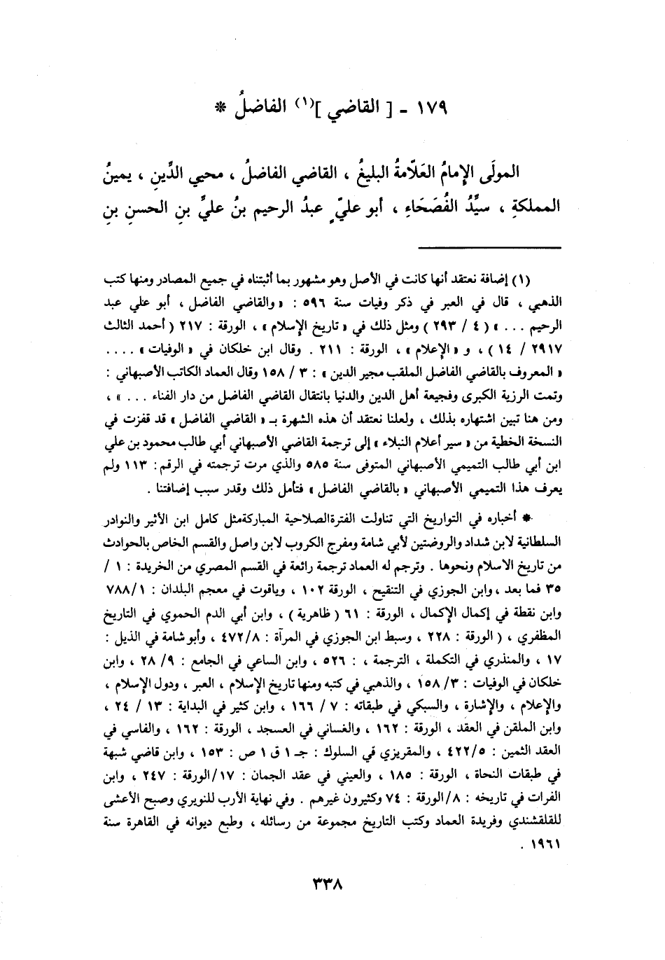وقال ابن خلكان في (الوفيات) ... (المعروف بالقاضي الفاضل الملقب مجير الدين) : 3 / 158 وقال العماد الكاتب الأصبهاني: وتمت الرزية الكبرى وفجيعة أهل الدين والدنيا بانتقال القاضي الفاضل من دار الفناء..) ، ومن هنا تبين اشتهاره بذلك، ولعلنا نعتقد أن هذه الشهرة ب (القاضي الفاضل) قد قفزت في النسخة الخطية من (سير أعلام النبلاء) إلى ترجمة القاضي الأصبهاني أبي طالب محمود بن علي ابن أبي طالب التميمي الأصبهاني المتوفى سنة 585 والذي مرت ترجمته في الرقم: 113 ولم يعرف هذا التميمي الأصبهاني (بالقاضي الفاضل) فتأمل ذلك وقدر سبب إضافتنا.