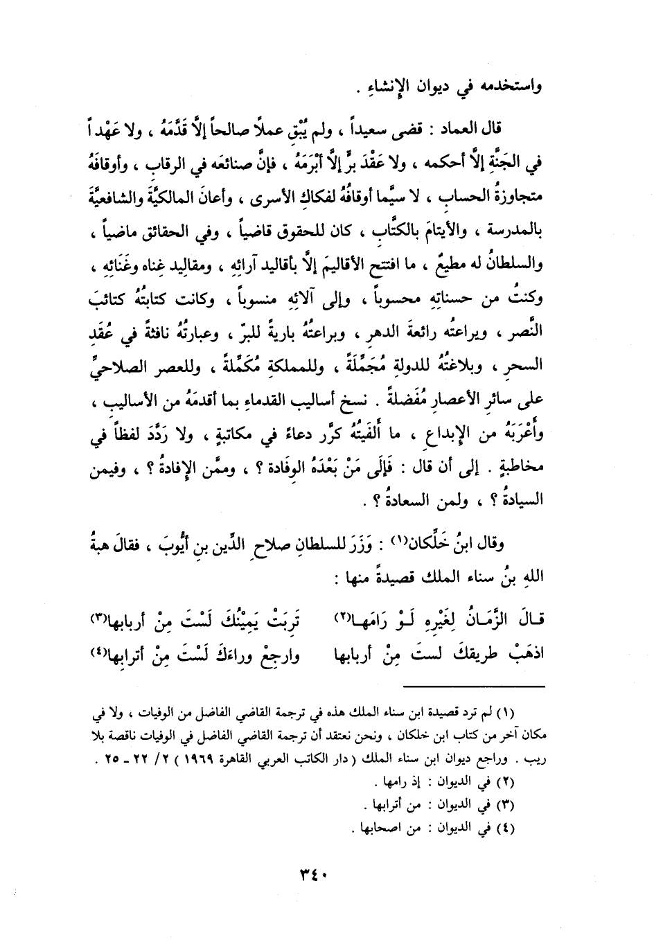 (1) لم ترد قصيدة ابن سناء الملك هذه في ترجمة القاضي الفاضل من الوفيات، ولا في مكان آخر من كتاب ابن خلكان، ونحن نعتقد أن ترجمة القاضي الفاضل في الوفيات ناقصة بلا ريب.