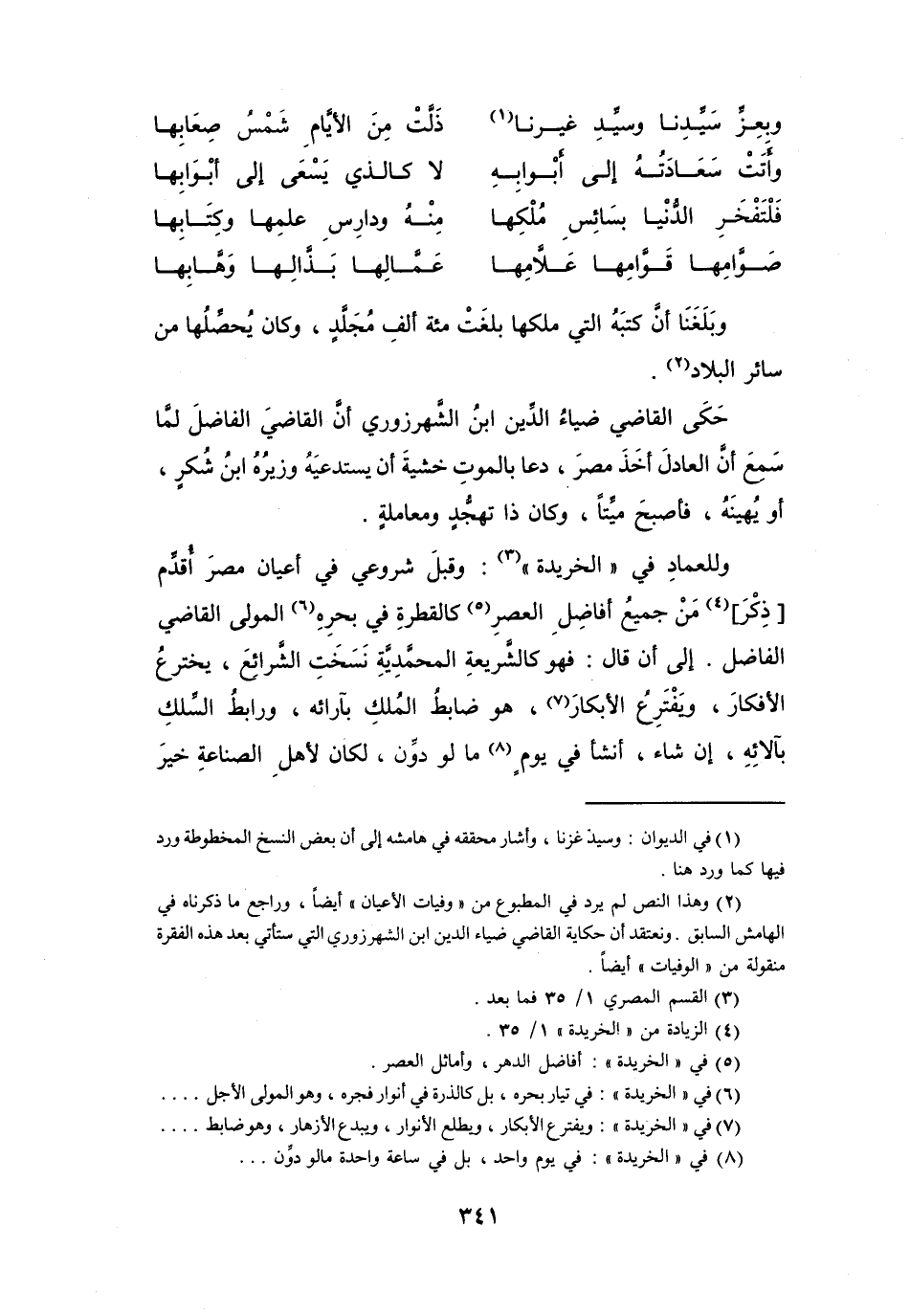 وَلِلْعِمَادِ فِي (الخريْدَةِ (3)) : وَقبلَ شروعِي فِي أَعيَانِ مِصْرَ، أُقَدِّمُ ذِكْرَ (4) مَنْ جَمِيْعُ أَفَاضِلِ العصرِ (5) كَالقطرَةِ فِي بحرِهِ (6) ، المَوْلَى القَاضِي الفَاضِلُ ... ، إِلَى أَنْ قَالَ: